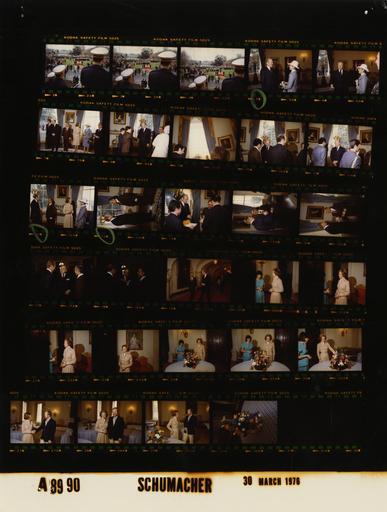 Keywords: Ford A8990 NLGRF photo contact sheet (1976-03-30)(Gerald Ford Library).jpg White House Photographic Office WHPO is housed at the Gerald R Ford Presidential Library a branch of the National Archives and Records Administration NARA <br/><br/> This file is a 200 dpi photo contact sheet having images from roll of film A8990 of the August 9 1974 - January 20 1977 Gerald R Ford White House Photographic Office Series A0001-A9999 and B0001-B2886 photographs <br/><br/> The date on the photo contact sheet is the date the roll of film was processed not necessarily the date the photographs were taken See table below for additional details 1976-03-30 Gerald R Ford Presidential Library Image http //www fordlibrarymuseum gov/library/whphotos/A8990_NLGRF jpg A8990_NLGRF jpg from http //www fordlibrarymuseum gov/library/whphotos/19760330whpo pdf White House Photographs March 30 1976 of the http //www fordlibrarymuseum gov/Library/whphotos/whpo asp White House Photographic Collection page White House Photographic Office WHPO - Schumacher PD-USGov Institution Institution Gerald R Ford Presidential Library Table wikitable sortable + Photo contact sheet A8990 U S President Ford Administration Gerald R Ford Library Frame s Tone Subject proper Subject generic Names Geographic Location Photographer Date - 2A-4A Color State Visit of Jordan's King Hussein I and Queen Alia-Arrival Ceremony long shots of arrival ceremony on lawn; band marching past platform; balcony trumpeters in foreground GRF King Hussein; Betty Ford Queen Alia; U S Marine Corps Band Drum Bugle Corps; Others South Lawn Schumacher 1976-03-30 - 5A-6A Color State Visit of Jordan's King Hussein I and Queen Alia-Arrival Reception standing together GRF Queen Alia Blue Room Schumacher 1976-03-30 - 7A Color State Visit of Jordan's King Hussein I and Queen Alia-Arrival Reception standing together GRF King Hussein; Betty Ford Queen Alia Kissinger; Catto Blue Room Schumacher 1976-03-30 - 8A Color State Visit of Jordan's King Hussein I and Queen Alia-Queen Alia and Party Departs After Morning Coffee with First Lady; Abdullah Hussein son of King Hussein I Princess Muna Al Hussein became King Abdullah II in 1999 upon the death of his father GRF handshaking with Prince Abdullah GRF Prince Abdullah Hussein; Unidentified son King Hussein I Blue Room Schumacher 1976-03-30 - 9A-11A Color State Visit of Jordan's King Hussein I and Queen Alia-Arrival Reception handshaking GRF Others Blue Room Schumacher 1976-03-30 - 12A Color State Visit of Jordan's King Hussein I and Queen Alia-Arrival Reception standing talking in pairs GRF King Hussein; Betty Ford Queen Alia Blue Room Schumacher 1976-03-30 - 113A16A Color State Visit of Jordan's King Hussein I and Queen Alia-Arrival Reception standing talking GRF King Hussein Blue Room Schumacher 1976-03-30 - 17A-18A Color State Visit of Jordan's King Hussein I and Queen Alia-Arrival Reception standing together talking camera on Rifa GRF Prime Minister Zayd Al-Rifa King Hussein Blue Room Schumacher 1976-03-30 - 19A Color State Visit of Jordan's King Hussein I and Queen Alia-Arrival Reception-departing walking together down hallway GRF King Hussein Cross Hall Schumacher 1976-03-30 - 20A-29A Color State Visit of Jordan's King Hussein I and Queen Alia-State Dinner; Preparations; Flowers standing talking; various angles and distances; all not in every frame Betty Ford Maria Downs; Unidentified Man State Dining Room Schumacher 1976-03-30 - 30A Color State Visit of Jordan's King Hussein I and Queen Alia-State Dinner; Preparations; Flowers floral centerpiece on blue and white tablecloth State Dining Room Schumacher 1976-03-30 Gerald R Ford Presidential Library and Museum-cooperation PD-USGov Contact sheets by the Ford White House March 1976
