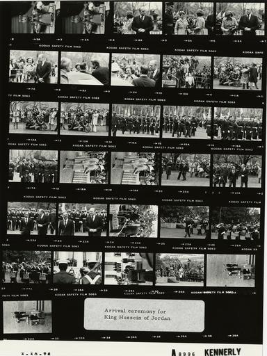 Keywords: Ford A8996 NLGRF photo contact sheet (1976-03-30)(Gerald Ford Library).jpg White House Photographic Office WHPO is housed at the Gerald R Ford Presidential Library a branch of the National Archives and Records Administration NARA <br/><br/> This file is a 200 dpi photo contact sheet having images from roll of film A8996 of the August 9 1974 - January 20 1977 Gerald R Ford White House Photographic Office Series A0001-A9999 and B0001-B2886 photographs <br/><br/> The date on the photo contact sheet is the date the roll of film was processed not necessarily the date the photographs were taken See table below for additional details 1976-03-30 Gerald R Ford Presidential Library Image http //www fordlibrarymuseum gov/library/whphotos/A8996_NLGRF jpg A8996_NLGRF jpg from http //www fordlibrarymuseum gov/library/whphotos/19760330whpo pdf White House Photographs March 30 1976 of the http //www fordlibrarymuseum gov/Library/whphotos/whpo asp White House Photographic Collection page White House Photographic Office WHPO <br/> Creator David Hume Kennerly PD-USGov Institution Institution Gerald R Ford Presidential Library Table wikitable sortable + Photo contact sheet A8996 U S President Ford Administration Gerald R Ford Library Frame s Tone Subject proper Subject generic Names Geographic Location Photographer Date - 2A-3A BW Small Doll Unidentified Location Kennerly 1976-03-30 - 4A-7A BW State Visit of Jordan's King Hussein I and Queen Alia-Arrival Ceremony standing waiting for limousine; BF holding red roses GRF Betty Ford South Driveway Kennerly 1976-03-30 - 8A-9A BW State Visit of Jordan's King Hussein I and Queen Alia-Arrival Ceremony standing waiting for limousine; BF holding red roses; greeting King and Queen backs to camera exiting limousine; various angles and distances; all not in every frame GRF Betty Ford Others South Driveway Kennerly 1976-03-30 - 10A BW State Visit of Jordan's King Hussein I and Queen Alia-Arrival Ceremony descending platform steps GRF King Hussein; Media South Lawn Kennerly 1976-03-30 - 11A-13A BW State Visit of Jordan's King Hussein I and Queen Alia-Arrival Ceremony press shooting; crowd behind rope in background Media Crowd South Lawn Kennerly 1976-03-30 - 14A-17A BW State Visit of Jordan's King Hussein I and Queen Alia-Arrival Ceremony inspecting the troops; GRF hand over heart GRF King Hussein Honor Guard South Lawn Kennerly 1976-03-30 - 18A-19A BW State Visit of Jordan's King Hussein I and Queen Alia-Arrival Ceremony standing together on grass Betty Ford Queen Alia South Lawn Kennerly 1976-03-30 - 20A-23A BW State Visit of Jordan's King Hussein I and Queen Alia-Arrival Ceremony walking on grass to platform; Honor Guard in background GRF King Hussein Honor Guard South Lawn Kennerly 1976-03-30 - 24A BW State Visit of Jordan's King Hussein I and Queen Alia-Arrival Ceremony ascending platform steps GRF King Hussein South Lawn Kennerly 1976-03-30 - 25A-27A BW State Visit of Jordan's King Hussein I and Queen Alia-Arrival Ceremony; US Marine Drum and Bugle Corps marching on grass U S Marine Drum Bugle Corps South Lawn Kennerly 1976-03-30 - 28A-32A BW State Visit of Jordan's King Hussein I and Queen Alia-Arrival Ceremony-Remarks standing on platform; GRF making remarks GRF King Hussein South Lawn Kennerly 1976-03-30 Gerald R Ford Presidential Library and Museum-cooperation PD-USGov Contact sheets by the Ford White House March 1976 Photographs by David Hume Kennerly from 1976 |