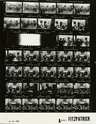 Keywords: Ford A9021 NLGRF photo contact sheet (1976-03-31)(Gerald Ford Library).jpg White House Photographic Office WHPO is housed at the Gerald R Ford Presidential Library a branch of the National Archives and Records Administration NARA <br/><br/> This file is a 200 dpi photo contact sheet having images from roll of film A9021 of the August 9 1974 - January 20 1977 Gerald R Ford White House Photographic Office Series A0001-A9999 and B0001-B2886 photographs <br/><br/> The date on the photo contact sheet is the date the roll of film was processed not necessarily the date the photographs were taken See table below for additional details 1976-03-31 Gerald R Ford Presidential Library Image http //www fordlibrarymuseum gov/library/whphotos/A9021_NLGRF jpg A9021_NLGRF jpg from http //www fordlibrarymuseum gov/library/whphotos/19760331whpo pdf White House Photographs March 31 1976 of the http //www fordlibrarymuseum gov/Library/whphotos/whpo asp White House Photographic Collection page White House Photographic Office WHPO - Fitz-Patrick PD-USGov Institution Institution Gerald R Ford Presidential Library Table wikitable sortable + Photo contact sheet A9021 U S President Ford Administration Gerald R Ford Library Frame s Tone Subject proper Subject generic Names Geographic Location Photographer Date - 3-9 BW White House Tour by White House Coordinator of Bicentennial Affairs standing on grass Mitler talking Milt Mitler Unidentified Group Rose Garden Fitz-Patrick 1976-03-31 - 10-12 BW Special Assistant to the President for Human Resources Marrs standing sitting; discussing framed item Ted Marrs Security Officer Unidentified Man Ted Marrs Office Fitz-Patrick 1976-03-31 - 13-15 BW Blank Fitz-Patrick 1976-03-31 - 16-28 BW Meeting to Announce Creation of a Cabinetlevel Task Force on Questionable Corporate Payments Abroad and the Appointment of Richardson as the Chairman of the Task Force; Commerce Secretary; Dir of Communications for Dept of Commerce Webb standing together; exchanging remarks seated in chairs by fireplace; Thomas standing taking notes in some frames; press microphones; varoius angles and distances; all not in every frame GRF Sec Elliott Richardson Horace S Webb Helen Thomas Oval Office Fitz-Patrick 1976-03-31 - 29-30 BW State Visit of Jordan's King Hussein I Queen Alia; Oval Office Meeting with King Hussein Jordan's Foreign Minister Rifai King Hussein leans over to sign book King Hussein Zeid Rifai Joseph Sisco Others Cabinet Room Fitz-Patrick 1976-03-31 - 31-37 BW State Visit of Jordan's King Hussein I and Queen Alia-Oval Office Meeting with King Hussein and Jordan's Foreign Minister seated in chairs by fireplace; various distances GRF King Hussein Oval Office Fitz-Patrick 1976-03-31 Gerald R Ford Presidential Library and Museum-cooperation PD-USGov Contact sheets by the Ford White House March 1976 |