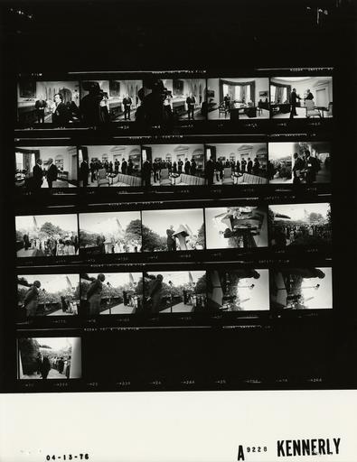 | Keywords: Ford A9228 NLGRF photo contact sheet (1976-04-13)(Gerald Ford Library).jpg White House Photographic Office WHPO is housed at the Gerald R Ford Presidential Library a branch of the National Archives and Records Administration NARA <br/><br/> This file is a 200 dpi photo contact sheet having images from roll of film A9228 of the August 9 1974 - January 20 1977 Gerald R Ford White House Photographic Office Series A0001-A9999 and B0001-B2886 photographs <br/><br/> The date on the photo contact sheet is the date the roll of film was processed not necessarily the date the photographs were taken See table below for additional details 1976-04-13 Gerald R Ford Presidential Library Image http //www fordlibrarymuseum gov/library/whphotos/A9228_NLGRF jpg A9228_NLGRF jpg from http //www fordlibrarymuseum gov/library/whphotos/19760413whpo pdf White House Photographs April 13 1976 of the http //www fordlibrarymuseum gov/Library/whphotos/whpo asp White House Photographic Collection page White House Photographic Office WHPO <br/> Creator David Hume Kennerly PD-USGov Institution Institution Gerald R Ford Presidential Library Table wikitable sortable + Photo contact sheet A9228 U S President Ford Administration Gerald R Ford Library Frame s Tone Subject proper Subject generic Names Geographic Location Photographer Date - 2A-4A BW Audio-Visual Taping for NBC's Saturday Night Show to be broadcast on 4/17/1976 GRF standing under Eisenhower portrait before NBC camera GRF; Nessen Cameraman NBC Staff Cabinet Room Kennerly 1976-04-13 - 5A BW At Work in Oval Office standing by desk holding paper smoking pipe GRF Oval Office Kennerly 1976-04-13 - 6A-7A BW Meeting with Attorney and Member of President's Foreign Intelligence Advisory Board PFIAB ; Former Texas Governor entering standing handshaking GRF John B Connally Oval Office Kennerly 1976-04-13 - 8A-10A BW Q A Session with members of American Society of Newspaper Editors panelists and others visiting in Oval Office prior to Q A session GRF George Chaplain; Mr Mrs Warren Phillips Abe Rosenthal Tony Day Howard Simmons Robert Bartley Wyatt Thomas Tom Johnson Oval Office Kennerly 1976-04-13 - 11A BW Q A Session with members of American Society of Newspaper Editors-enroute to; Wall Street Journal editor walking from Oval Office to Rose Garden GRF Warren Phillips Colonnade Kennerly 1976-04-13 - 12A-22A BW Q A Session with members of American Society of Newspaper Editors; Washington Post Managing Editor Simmons GRF standing on steps editors on grass East Wing in background; Simmons at microphone asking question 17-21 ; GRF returning to Oval Office GRF Howard Simmons; Editors Rose Garden Kennerly 1976-04-13 Gerald R Ford Presidential Library and Museum-cooperation PD-USGov Contact sheets by the Ford White House April 1976 Photographs by David Hume Kennerly from 1976 |