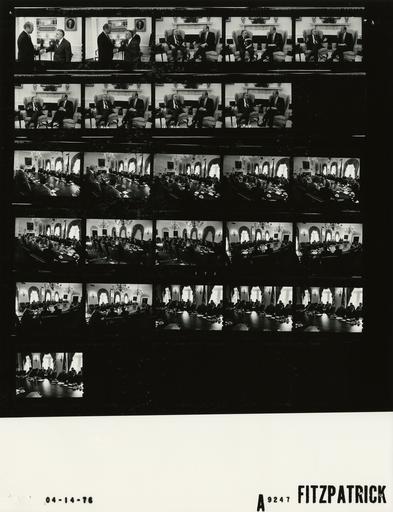 | Keywords: Ford A9247 NLGRF photo contact sheet (1976-04-12)(Gerald Ford Library).jpg White House Photographic Office WHPO is housed at the Gerald R Ford Presidential Library a branch of the National Archives and Records Administration NARA <br/><br/> This file is a 200 dpi photo contact sheet having images from roll of film A9247 of the August 9 1974 - January 20 1977 Gerald R Ford White House Photographic Office Series A0001-A9999 and B0001-B2886 photographs <br/><br/> The date on the photo contact sheet is the date the roll of film was processed not necessarily the date the photographs were taken See table below for additional details 1976-04-12 Gerald R Ford Presidential Library Image http //www fordlibrarymuseum gov/library/whphotos/A9247_NLGRF jpg A9247_NLGRF jpg from http //www fordlibrarymuseum gov/library/whphotos/19760412whpo pdf White House Photographs April 12 1976 of the http //www fordlibrarymuseum gov/Library/whphotos/whpo asp White House Photographic Collection page White House Photographic Office WHPO - Fitz-Patrick PD-USGov Institution Institution Gerald R Ford Presidential Library Table wikitable sortable + Photo contact sheet A9247 U S President Ford Administration Gerald R Ford Library Frame s Tone Subject proper Subject generic Names Geographic Location Photographer Date - 3A-11A BW Meeting with Unidentified Individual entering handshaking; seated in chairs by fireplace GRF Unidentified Man Oval Office Fitz-Patrick 1976-04-12 - 12A BW Fitz-Patrick 1976-04-13 - 13A-28A BW Meeting with House Republican Whips; US Congressmen seated around table and against walls GRF Whips Reps R Michel B Talcott J Myers Bill Young J McDade; Asst Whips Reps R Lagomarsino W Armstrong C Thone B Frenzel Bud Brown P Findley G Taylor S Conte D Mitchell; F Schrontz J T Rowland Morton Rumsfeld Marsh Cabinet Room Fitz-Patrick 1976-04-13 Gerald R Ford Presidential Library and Museum-cooperation PD-USGov Contact sheets by the Ford White House April 1976 |
