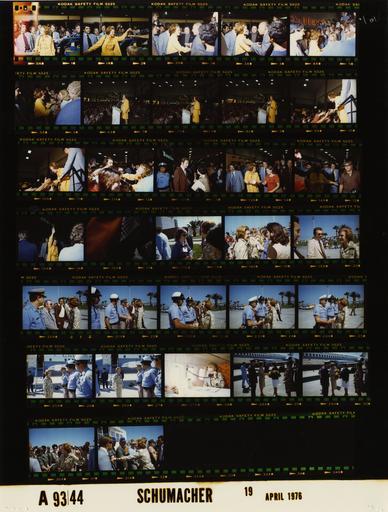 | Keywords: Ford A9344 NLGRF photo contact sheet (1976-04-20)(Gerald Ford Library).jpg White House Photographic Office WHPO is housed at the Gerald R Ford Presidential Library a branch of the National Archives and Records Administration NARA <br/><br/> This file is a 200 dpi photo contact sheet having images from roll of film A9344 of the August 9 1974 - January 20 1977 Gerald R Ford White House Photographic Office Series A0001-A9999 and B0001-B2886 photographs <br/><br/> The date on the photo contact sheet is the date the roll of film was processed not necessarily the date the photographs were taken See table below for additional details 1976-04-20 Gerald R Ford Presidential Library Image http //www fordlibrarymuseum gov/library/whphotos/A9344_NLGRF jpg A9344_NLGRF jpg from http //www fordlibrarymuseum gov/library/whphotos/19760420whpo pdf White House Photographs April 20 1976 of the http //www fordlibrarymuseum gov/Library/whphotos/whpo asp White House Photographic Collection page White House Photographic Office WHPO - Schumacher PD-USGov Institution Institution Gerald R Ford Presidential Library Table wikitable sortable + Photo contact sheet A9344 U S President Ford Administration Gerald R Ford Library Frame s Tone Subject proper Subject generic Names Geographic Location Photographer Date - 0A-15A Color First Lady Campaign Trip to Texas-Stopby at Mall to Distribute Campaign Buttons-First Lady Remarks Betty arriving handshaking; making remarks at podium above crowd; handshaking departing Betty Ford Secret Service Crowd Corpus Christi TX Padre Staples Mall Schumacher 1976-04-20 - 16A Color No subject Corpus Christi TX Hilton Inn Schumacher 1976-04-20 - 17A-26A Color First Lady Campaign Trip to Texas-Airport Departure standing talking handshaking on tarmac in front of plane; various angles and distances; all not in every frame Betty Ford Media Unidentified Men Police Officers Corpus Christi TX Corpus Christi International Airport Schumacher 1976-04-21 - 27A Color First Lady Campaign Trip to Texas- Flight from San Antonio to Houston Texs seated at table talking on telephone Betty Ford Aboard C-9 Aircraft Schumacher 1976-04-21 - 28A-29A Color First Lady Campaign Trip to Texas-Airport Arrival standing on tarmac in front of plane presenting yellow roses handshaking; handshaking with men in military uniforms Betty Ford Col Mrs Clifton Rogers Col Mrs G F Marsella Houston TX Ellington AFB Schumacher 1976-04-21 - 30A-31A Color First Lady Campaign Trip to Texas-Airport Arrival greeting handshaking; various angles; all not in both frames Betty Ford Air Force Personnel Others Houston TX Ellington AFB Schumacher 1976-04-21 - 30A-31A Color First Lady Campaign Trip to Texas-Bicentennial Celebration for 140th Anniversary of Battle of San Jacinto and 28th Anniversary of Battleship Presentation to Texas; campaign placards; senior citizens elderly Betty working crowd receiving quilt with gold star; crowd holding signs Hello First Momma Grandpas Like Betty Texas Nursing Home Association Betty Ford Crowd Houston TX San Jacinto Battleground Park Schumacher 1976-04-21 Gerald R Ford Presidential Library and Museum-cooperation PD-USGov Contact sheets by the Ford White House April 1976 |