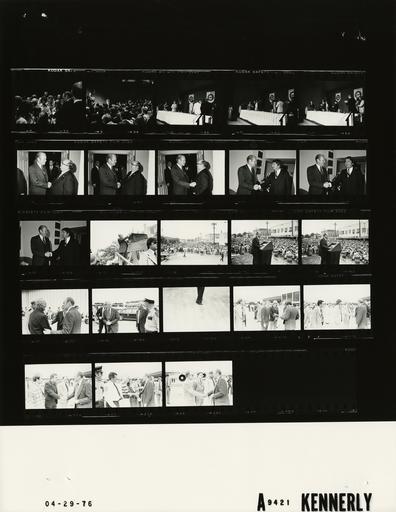 Keywords: Ford A9421 NLGRF photo contact sheet (1976-04-29)(Gerald Ford Library).jpg White House Photographic Office WHPO is housed at the Gerald R Ford Presidential Library a branch of the National Archives and Records Administration NARA <br/><br/> This file is a 200 dpi photo contact sheet having images from roll of film A9421 of the August 9 1974 - January 20 1977 Gerald R Ford White House Photographic Office Series A0001-A9999 and B0001-B2886 photographs <br/><br/> The date on the photo contact sheet is the date the roll of film was processed not necessarily the date the photographs were taken See table below for additional details 1976-04-29 Gerald R Ford Presidential Library Image http //www fordlibrarymuseum gov/library/whphotos/A9421_NLGRF jpg A9421_NLGRF jpg from http //www fordlibrarymuseum gov/library/whphotos/19760429whpo pdf White House Photographs April 29 1976 of the http //www fordlibrarymuseum gov/Library/whphotos/whpo asp White House Photographic Collection page White House Photographic Office WHPO <br/> Creator David Hume Kennerly PD-USGov Institution Institution Gerald R Ford Presidential Library Table wikitable sortable + Photo contact sheet A9421 U S President Ford Administration Gerald R Ford Library Frame s Tone Subject proper Subject generic Names Geographic Location Photographer Date - 2 BW Primary Campaign Trip to Texas-Breakfast Reception for Texas PFC Staff Volunteers and Delegates GRF standing talking to group of adults and children GRF Guests Houston TX Hyatt Regency Hotel Kennerly 1976-04-29 - 3 BW Primary Campaign Trip to Texas-President's 31st Press Conference sponsored by Houston Chapter of Sigma Delta Chi national journalism fraternity GRF at podium reporter standing audience seated GRF Audience reporters Houston TX Hyatt Regency Hotel - Imperial Ballroom West Kennerly 1976-04-29 - 4-6 BW Primary Campaign Trip to Texas-Texas Nursing Home Association Annual Meeting GRF platform guests standing talking; GRF at podium GRF Sen John Tower Douglas Pendergras Donald Brewer Sid Rich U A Hyde Richard Kalish Louise Mayberry Houston TX Hyatt Regency Hotel - Imperial Ballroom Center Kennerly 1976-04-29 - 7-9 BW Primary Campaign Trip to Texas-Photo Op standing near doorway handshaking GRF Unidentified Man Houston TX Hyatt Regency Hotel - Presidential Suite Kennerly 1976-04-29 - 10-12 BW Primary Campaign Trip to Texas-Photo Op with PFC National Finance Chairman Mosbacher standing handshaking GRF Robert Mosbacher Houston TX Hyatt Regency Hotel - Presidential Suite Kennerly 1976-04-29 - 13-16 BW Primary Campaign Trip to Texas-Parade in Honor of GRF Unveiling Ceremony for Montgomery County Texas War Memorial Park-Remarks GRF unveiling plaque standing at podium before large crowd; retail stores in background GRF Crowd Conroe TX Montgomery County Texas War Memorial Park Kennerly 1976-04-29 - 17-24 BW Primary Campaign Trip to Texas-Airport Departure GRF leaving motorcade on tarmac greeting elderly man; autographing handshaking on tarmac GRF Unidentified Man Police Officers Unidentified Men Houston TX Houston International Airport Kennerly 1976-04-29 Gerald R Ford Presidential Library and Museum-cooperation PD-USGov Contact sheets by the Ford White House April 1976 Photographs by David Hume Kennerly from 1976 |