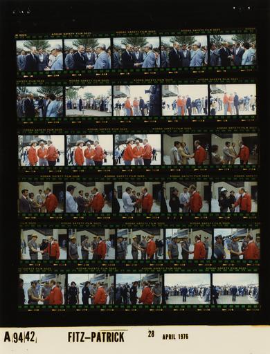 | Keywords: Ford A9442 NLGRF photo contact sheet (1976-04-30)(Gerald Ford Library).jpg White House Photographic Office WHPO is housed at the Gerald R Ford Presidential Library a branch of the National Archives and Records Administration NARA <br/><br/> This file is a 200 dpi photo contact sheet having images from roll of film A9442 of the August 9 1974 - January 20 1977 Gerald R Ford White House Photographic Office Series A0001-A9999 and B0001-B2886 photographs <br/><br/> The date on the photo contact sheet is the date the roll of film was processed not necessarily the date the photographs were taken See table below for additional details 1976-04-30 Gerald R Ford Presidential Library Image http //www fordlibrarymuseum gov/library/whphotos/A9442_NLGRF jpg A9442_NLGRF jpg from http //www fordlibrarymuseum gov/library/whphotos/19760430whpo pdf White House Photographs April 30 1976 of the http //www fordlibrarymuseum gov/Library/whphotos/whpo asp White House Photographic Collection page White House Photographic Office WHPO - Fitz-Patrick PD-USGov Institution Institution Gerald R Ford Presidential Library Table wikitable sortable + Photo contact sheet A9442 U S President Ford Administration Gerald R Ford Library Frame s Tone Subject proper Subject generic Names Geographic Location Photographer Date - 3-9 Color Primary Campaign Trip to Texas-Fundraising Reception Hosted by West Texas President Ford Committee PFC handshaking GRF at microphone outdoors with guests GRF Guests Lubbock TX Robert W Blake Residence Fitz-Patrick 1976-04-30 - 10-15 Color Primary Campaign Trip to Texas-Airport Presentation by American Business Club Rodeo group; red jacket GRF receives document and wears red ABC jacket; all in red jackets; handshaking GRF Charles B Perry Others Lubbock TX Lubbock Municipal Airport Fitz-Patrick 1976-04-30 - 16-30 Color Primary Campaign Trip to Texas; Airport Arrival; American Business Club Rodeo Jacket -Abilene Texas handshaking on tarmac; wearing red American Business Club Rodeo jacket GRF Others Abilene TX Dyess AFB Fitz-Patrick 1976-04-30 - 31-32 Color Primary Campaign Trip to Texas; Q A Session with Press upon Airport Arrival - Abilene Texas camera behindf GRF and facing press GRF Media Abilene TX Dyess AFB Fitz-Patrick 1976-04-30 Gerald R Ford Presidential Library and Museum-cooperation PD-USGov Contact sheets by the Ford White House April 1976 |