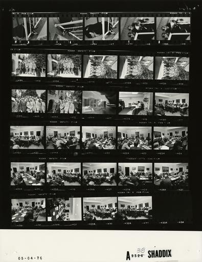 | Keywords: Ford A9538 NLGRF photo contact sheet (1976-05-04)(Gerald Ford Library).jpg White House Photographic Office WHPO is housed at the Gerald R Ford Presidential Library a branch of the National Archives and Records Administration NARA <br/><br/> This file is a 200 dpi photo contact sheet having images from roll of film A9538 of the August 9 1974 - January 20 1977 Gerald R Ford White House Photographic Office Series A0001-A9999 and B0001-B2886 photographs <br/><br/> The date on the photo contact sheet is the date the roll of film was processed not necessarily the date the photographs were taken See table below for additional details 1976-05-04 Gerald R Ford Presidential Library Image http //www fordlibrarymuseum gov/library/whphotos/A9538_NLGRF jpg A9538_NLGRF jpg from http //www fordlibrarymuseum gov/library/whphotos/19760504whpo pdf White House Photographs May 4 1976 of the http //www fordlibrarymuseum gov/Library/whphotos/whpo asp White House Photographic Collection page White House Photographic Office WHPO - Shaddix PD-USGov Institution Institution Gerald R Ford Presidential Library Table wikitable sortable + Photo contact sheet A9538 U S President Ford Administration Gerald R Ford Library Frame s Tone Subject proper Subject generic Names Geographic Location Photographer Date - 4A-8A BW White House Office; Dog unidentified dog seated on floor with paws through railing dog Unidentified office Shaddix 1976-05-04 - 9A-15A BW Small Businessman's White House Briefing hosted by John Schlaes standing on steps posing Unidentified businessmen Steps to Truman Balcony Shaddix 1976-05-04 - 16A-17A BW White House Office; White House staff seated at desk writing Unidentified Woman Unidentified office Shaddix 1976-05-04 - 18A-32A BW Businessman's White House Briefing hosted by newly-appointed Director of WH Conferences John Shlaes setaed at table along walls Unidentified businessmen; John Shlaes Roosevelt Room Shaddix 1976-05-04 Gerald R Ford Presidential Library and Museum-cooperation PD-USGov Contact sheets by the Ford White House May 1976 |