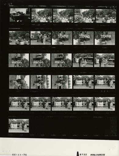 | Keywords: Ford A9732 NLGRF photo contact sheet (1976-05-11)(Gerald Ford Library).jpg White House Photographic Office WHPO is housed at the Gerald R Ford Presidential Library a branch of the National Archives and Records Administration NARA <br/><br/> This file is a 200 dpi photo contact sheet having images from roll of film A9732 of the August 9 1974 - January 20 1977 Gerald R Ford White House Photographic Office Series A0001-A9999 and B0001-B2886 photographs <br/><br/> The date on the photo contact sheet is the date the roll of film was processed not necessarily the date the photographs were taken See table below for additional details 1976-05-11 Gerald R Ford Presidential Library Image http //www fordlibrarymuseum gov/library/whphotos/A9732_NLGRF jpg A9732_NLGRF jpg from http //www fordlibrarymuseum gov/library/whphotos/19760511whpo pdf White House Photographs May 11 1976 of the http //www fordlibrarymuseum gov/Library/whphotos/whpo asp White House Photographic Collection page White House Photographic Office WHPO - Fitz-Patrick PD-USGov Institution Institution Gerald R Ford Presidential Library Table wikitable sortable + Photo contact sheet A9732 U S President Ford Administration Gerald R Ford Library Frame s Tone Subject proper Subject generic Names Geographic Location Photographer Date - 2 BW Out of Focus Unknown Fitz-Patrick 1976-05-11 - 3-7 BW Signing Ceremony for H R 10230 creating Office of Science and Technology OSTP -GRF Remarks GRF seated at table on grass making remarks; others standing seated on grass GRF Rockefeller Guyford Stever Others Secret Service East Garden Fitz-Patrick 1976-05-11 - 8-27 BW Photo Op with Multiple Sclerosis Society's Mother and Father of the Year 1976 GRF handshaking with families; on grass; girl holding doll man seated in wheel chair; various angles and distances; all not in every frame GRF Sharon Amy Michael Clarke Van Meter; Ralph Randi Ruth Rosanna Rikard Mr Mrs Ralph Rikard Jr Rose Garden Fitz-Patrick 1976-05-11 Gerald R Ford Presidential Library and Museum-cooperation PD-USGov Contact sheets by the Ford White House May 1976 |