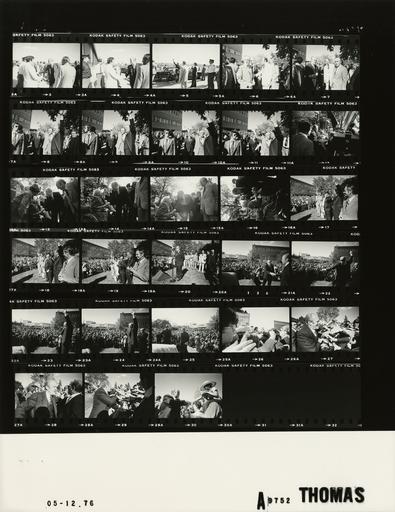 | Keywords: Ford A9752 NLGRF photo contact sheet (1976-05-12)(Gerald Ford Library).jpg White House Photographic Office WHPO is housed at the Gerald R Ford Presidential Library a branch of the National Archives and Records Administration NARA <br/><br/> This file is a 200 dpi photo contact sheet having images from roll of film A9752 of the August 9 1974 - January 20 1977 Gerald R Ford White House Photographic Office Series A0001-A9999 and B0001-B2886 photographs <br/><br/> The date on the photo contact sheet is the date the roll of film was processed not necessarily the date the photographs were taken See table below for additional details 1976-05-12 Gerald R Ford Presidential Library Image http //www fordlibrarymuseum gov/library/whphotos/A9752_NLGRF jpg A9752_NLGRF jpg from http //www fordlibrarymuseum gov/library/whphotos/19760512whpo pdf White House Photographs May 12 1976 of the http //www fordlibrarymuseum gov/Library/whphotos/whpo asp White House Photographic Collection page White House Photographic Office WHPO - Thomas PD-USGov Institution Institution Gerald R Ford Presidential Library Table wikitable sortable + Photo contact sheet A9752 U S President Ford Administration Gerald R Ford Library Frame s Tone Subject proper Subject generic Names Geographic Location Photographer Date - 3-5 BW Primary Campaign Trip to Michigan-Meeting of Economic Club of Detroit-Departing from standing outside by limo handshaking; GRF waving to crowd by limo door GRF Unidentified Men Police Officers Secret Service Crowd Bloomfield Hills MI Roma Hall Thomas 1976-05-12 - 6-11 BW Primary Campaign Trip to Michigan; Shain Park Campaign Rally; Governor and former Governor of Michigan MI ; Birmingham Mayor Staples Romney Millikin; Romney Milliken GRF Romney GRF; standing waving posing GRF former Gov George Romney; Gov William Milliken Others Crowd Secret Service; Mayor Sam Staples Birmingham MI Shain Park Thomas 1976-05-12 - 12-16 BW Primary Campaign Trip to Michigan; Shain Park Campaign Rally; Birmingham Mayor Staples GRF handshaking with elderly woman in wheelchair others GRF Crowd Mayor Sam Staples Birmingham MI Shain Park Thomas 1976-05-12 - 17-20 BW Primary Campaign Trip to Michigan; Shain Park Campaign Rally; Michigan Republican Party officials and elected representatives; Birmingham Mayor Staples; Michigan MI State Representatives; standing together on grass GRF waving; Mayor Staples at microphone GRF Mayor Sam Staples Chrm Arthur Elliott; Reps Ruth McNamee Rep Donald Bishop James Defebaugh; Chrm Arthur Saltzman Exec Daniel Murphy Chrm Jean Chamberlain Birmingham MI Shain Park Thomas 1976-05-12 - 21-25 BW Primary Campaign Trip to Michigan; Shain Park Campaign Rally; Michigan Republican Party officials and elected representatives; Birmingham Mayor Staples handshaking at microphone GRF waving to crowd GRF Mayor Sam Staples Crowd Birmingham MI Shain Park Thomas 1976-05-12 - 26-30 BW Primary Campaign Trip to Michigan-Shain Park Campaign Rally-Departing GRF working crowd GRF Crowd Birmingham MI Shain Park Thomas 1976-05-12 Gerald R Ford Presidential Library and Museum-cooperation PD-USGov Contact sheets by the Ford White House May 1976 |