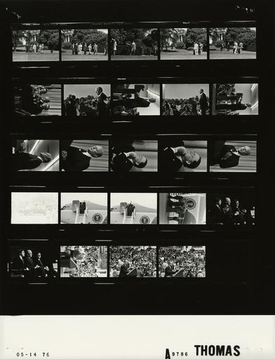 | Keywords: Ford A9786 NLGRF photo contact sheet (1976-05-12)(Gerald Ford Library).jpg  White House Photographic Office WHPO is housed at the Gerald R Ford Presidential Library a branch of the National Archives and Records Administration NARA <br/><br/> This file is a 200 dpi photo contact sheet having images from roll of film A9786 of the August 9 1974 - January 20 1977 Gerald R Ford White House Photographic Office Series A0001-A9999 and B0001-B2886 photographs <br/><br/> The date on the photo contact sheet is the date the roll of film was processed not necessarily the date the photographs were taken See table below for additional details 1976-05-12 Gerald R Ford Presidential Library Image http //www fordlibrarymuseum gov/library/whphotos/A9786_NLGRF jpg A9786_NLGRF jpg from http //www fordlibrarymuseum gov/library/whphotos/19760512whpo pdf White House Photographs May 12 1976 of the http //www fordlibrarymuseum gov/Library/whphotos/whpo asp White House Photographic Collection page White House Photographic Office WHPO - Thomas PD-USGov Institution Institution Gerald R Ford Presidential Library Table wikitable sortable + Photo contact sheet A9786 U S President Ford Administration Gerald R Ford Library Frame s Tone Subject proper Subject generic Names Geographic Location Photographer Date - 3A-7A BW Primary Campaign Trip to Michigan-White House Departure for staff walking from White House across lawn; GRF O'Donnell walking across grass staff in a circle; woman waving at camera Nessen Cheney Marsh Hartmann Byron Red Cavaney Others; Unidentified Woman; GRF O'Donnell Thomas 1976-05-12 - 8A BW Primary Campaign Trip to Michigan-Meeting of Economic Club of Detroit-Economic Club Chrm MacDonald and Presidetn Swaney seated together on stage GRF Ray MacDonald Russ Swaney Bloomfield Hills MI Roma Hall Thomas 1976-05-12 - 9A-14A BW Primary Campaign Trip to Michigan-Meeting of Economic Club of Detroit-GRF Remarks GRF at podium midrange; GRF portrait GRF; Audience Media Bloomfield Hills MI Roma Hall Thomas 1976-05-12 - 15A-16A BW Primary Campaign Trip to Michigan; Meeting of Economic Club of Detroit; GRF Remarks; US Senator from Michigan MI portrait; seated listening to GRF remarks Sen Robert P Griffin Bloomfield Hills MI Roma Hall Thomas 1976-05-12 - 17A BW Primary Campaign Trip to Michigan-Meeting of Economic Club of Detroit-GRF Remarks GRF at podium midrange; GRF portrait GRF Bloomfield Hills MI Roma Hall Thomas 1976-05-12 - 18A BW Primary Campaign Trip to Michigan-Motorcade GRF waving from sunroof motorcade Crowd Detroit MI Unidentified Thomas 1976-05-12 - 19A-21A BW Primary Campaign Trip to Tennessee; Airport Arrival; US Representative from Tennessee TN waving from top of ramp to Air Force One planegreeting handshaking at base of steps in 21A GRF; Rep James H Quillen Memphis TN Tri-City Airport Thomas 1976-05-14 - 22A-23A BW Primary Campaign Trip to Tennessee-Campaign Rally; Republican Country Chairman Williams; US Senator from Tennessee TN seated together onstage GRF Sen Howard Baker; Ed Williams III Johnson City TN Freedom Hall Convention Center Thomas 1976-05-14 - 24A-26A BW Primary Campaign Trip to Tennessee-Campaign Rally GRF at podium addressing crowd GRF Crowd Memphis TN Mid-America Mall Thomas 1976-05-14 Gerald R Ford Presidential Library and Museum-cooperation PD-USGov Contact sheets by the Ford White House May 1976  |