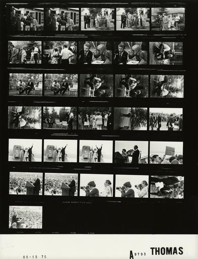 Keywords: Ford A9793 NLGRF photo contact sheet (1976-05-16)(Gerald Ford Library).jpg White House Photographic Office WHPO is housed at the Gerald R Ford Presidential Library a branch of the National Archives and Records Administration NARA <br/><br/> This file is a 200 dpi photo contact sheet having images from roll of film A9793 of the August 9 1974 - January 20 1977 Gerald R Ford White House Photographic Office Series A0001-A9999 and B0001-B2886 photographs <br/><br/> The date on the photo contact sheet is the date the roll of film was processed not necessarily the date the photographs were taken See table below for additional details 1976-05-16 Gerald R Ford Presidential Library Image http //www fordlibrarymuseum gov/library/whphotos/A9793_NLGRF jpg A9793_NLGRF jpg from http //www fordlibrarymuseum gov/library/whphotos/19760516whpo pdf White House Photographs May 16 1976 of the http //www fordlibrarymuseum gov/Library/whphotos/whpo asp White House Photographic Collection page White House Photographic Office WHPO - Thomas PD-USGov Institution Institution Gerald R Ford Presidential Library Table wikitable sortable + Photo contact sheet A9793 U S President Ford Administration Gerald R Ford Library Frame s Tone Subject proper Subject generic Names Geographic Location Photographer Date - 4A-10A BW Primary Campaign Whistle-Stop by Dr James Ford Residence; GRF's step-brothers Thomas James Ford standing at doorway kissing farewells GRF Susan Ford Jack Ford Dr Mrs James Barbara Ford Betty Ford Rep Thomas G Ford Grand Rapids MI James Ford Residence Thomas 1976-05-16 - 11A-12A BW Primary Campaign Whistle-Outdoor Luncheon at Secchia Residence; President Universal Forest Products standing at doorway kissing farwells Susan Ford Don Penny Schneider Grand Rapids MI Peter J Secchia Residence Thomas 1976-05-16 - 13A-20A BW Primary Campaign Whistle-Stop Tour of Michigan-Outdoor Luncheon at Secchia Residence; President Universal Forest Products seated on lawn chairs eating talking; Secchia wearing barbecue apron; Tom Ford in last frame only GRF Peter Secchia; Rep Thomas G Ford Grand Rapids MI Peter J Secchia Residence Thomas 1976-05-16 - 21A BW Primary Campaign Whistle-Stop Tour of Michigan-Outdoor Luncheon at Secchia Residence seated on lawn chairs eating talking; Secchia wearing barbecue apron; James Ford in last frame Betty Ford Guests O'Donnell Grand Rapids MI Peter J Secchia Residence Thomas 1976-05-16 - 22A BW Primary Campaign Whistle-Stop Tour of Michigan-Outdoor Luncheon at Secchia Residence; President's Personal Physician walking on grass by driveway Lukash Grand Rapids MI Peter J Secchia Residence Thomas 1976-05-16 - 23A BW Primary Campaign Whistle-Stop Tour of Michigan-Departing Grand Rapids GRF walking past crowd behind fence waving GRF Crowd O'Donnell Secret Service Grand Rapids MI Kent County Airport Thomas 1976-05-16 - 24A-26A BW Primary Campaign Whistle-Departing Grand Rapid; Air Force One waving from top of ramp of plane GRF Betty Ford Susan Ford Grand Rapids MI Kent County Airport Thomas 1976-05-16 - 27A BW Primary Campaign Whistle-Stop Tour of Michigan; Saginaw Township Bicentennial Celebration; Eagle Plaque Presentation; Chairman Saginaw Township Bicentennial Committee - Saginaw Michigan GRF and Ferguson at podium present eagle plaque GRF Thomas S Ferguson Crowd Saginaw MI Sherwood Elementary School Thomas 1976-05-16 - 28A BW Primary Campaign Whistle-Stop Tour of Michigan; Saginaw Michigan holding clever sign based on Ford Man in Crowd Saginaw MI Sherwood Elementary School Thomas 1976-05-16 - 29A-30A BW Primary Campaign Whistle-Stop Tour of Michigan; Saginaw Township Bicentennial Celebration; GRF Remarks - Saginaw Michigan side view GRF making remarks at podium crowd in background GRF Crowd Saginaw MI Sherwood Elementary School Thomas 1976-05-16 - 31A-32A BW Primary Campaign Whistle-Stop Tour of Michigan; Saginaw Township Bicentennial Celebration; GRF Remarks - Saginaw Michigan side view shooting photographs Two Unidentified females male Saginaw MI Sherwood Elementary School Thomas 1976-05-16 - 33A BW Primary Campaign Whistle-Stop Tour of Michigan; Saginaw Township Bicentennial Celebration; GRF Remarks - Saginaw Michigan talking in bleachers; man with 1970s hair Don Penny Schneider O'Donnell Crowd Saginaw MI Sherwood Elementary School Thomas 1976-05-16 - 34A BW Primary Campaign Whistle-Stop Tour of Michigan; Saginaw Township Bicentennial Celebration; GRF Remarks - Saginaw Michigan side view GRF making remarks at podium crowd in background GRF Crowd Saginaw MI Sherwood Elementary School Thomas 1976-05-16 Gerald R Ford Presidential Library and Museum-cooperation PD-USGov Contact sheets by the Ford White House May 1976 |