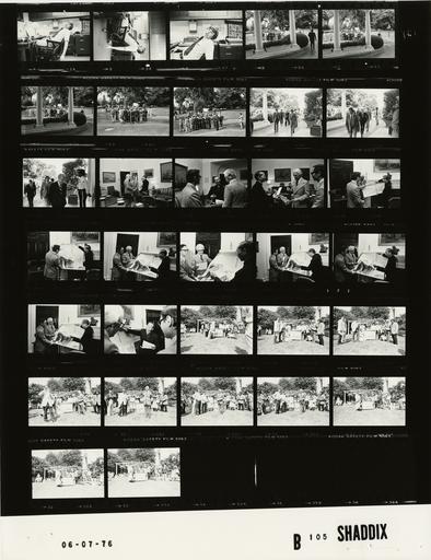 Keywords: Ford B0105 NLGRF photo contact sheet (1976-06-03)(Gerald Ford Library).jpg White House Photographic Office WHPO is housed at the Gerald R Ford Presidential Library a branch of the National Archives and Records Administration NARA <br/><br/> This file is a 200 dpi photo contact sheet having images from roll of film B0105 of the August 9 1974 - January 20 1977 Gerald R Ford White House Photographic Office Series A0001-A9999 and B0001-B2886 photographs <br/><br/> The date on the photo contact sheet is the date the roll of film was processed not necessarily the date the photographs were taken See table below for additional details 1976-06-03 Gerald R Ford Presidential Library Image http //www fordlibrarymuseum gov/library/whphotos/B0105_NLGRF jpg B0105_NLGRF jpg from http //www fordlibrarymuseum gov/library/whphotos/19760603whpo pdf White House Photographs June 3 1976 of the http //www fordlibrarymuseum gov/Library/whphotos/whpo asp White House Photographic Collection page White House Photographic Office WHPO - Shaddix PD-USGov Institution Institution Gerald R Ford Presidential Library Table wikitable sortable + Photo contact sheet B0105 U S President Ford Administration Gerald R Ford Library Frame s Tone Subject proper Subject generic Names Geographic Location Photographer Date - 2-4 B White House Photographer leaning back in chair feet up posing with mouth open Fitz-Patrick Ground Floor -White House Photo Office Shaddix 1976-06-03 - 5-9 B Question and Answer Session with Media; Governor of Iowa IA GRF Ray amd media in background; GRF barely visible; pillars of North Portico visible in foreground GRF Gov Ray Media North Grounds Shaddix 1976-06-03 - 10-12 B Following Question and Answer Session with Media walking back to White House; moving toward White House; pillars of North Portico visible in background GRF Secret Service North Portico Shaddix 1976-06-03 - 13-23 B Bicentennial Gift Presentation standing talking looking at painting; one man wearing a Roman collar; various angles and distances Mitler Two Asian Men Public Liaison Office - Mitler's Office Shaddix 1976-06-03 - 24-33 B Bicentennial Gift Presentation standing kneeling posing with eagle and flag painting Vickerman Unidentified Group of Mena Women Jacqueline Kennedy Garden -East Garden Shaddix 1976-06-03 Gerald R Ford Presidential Library and Museum-cooperation PD-USGov Contact sheets by the Ford White House June 1976 |