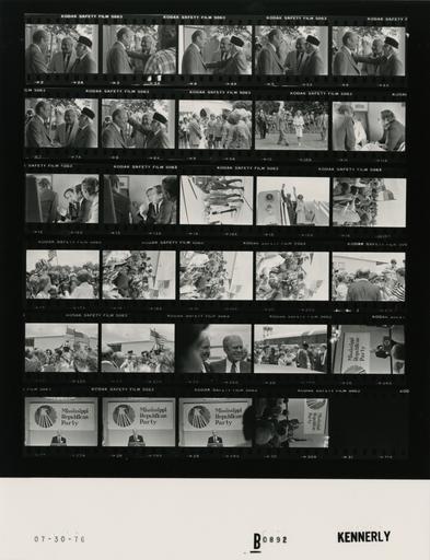 | Keywords: Ford B0892 NLGRF photo contact sheet (1976-07-30)(Gerald Ford Library).jpg White House Photographic Office WHPO is housed at the Gerald R Ford Presidential Library a branch of the National Archives and Records Administration NARA <br/><br/> This file is a 200 dpi photo contact sheet having images from roll of film B0892 of the August 9 1974 - January 20 1977 Gerald R Ford White House Photographic Office Series A0001-A9999 and B0001-B2886 photographs <br/><br/> The date on the photo contact sheet is the date the roll of film was processed not necessarily the date the photographs were taken See table below for additional details 1976-07-30 Gerald R Ford Presidential Library Image http //www fordlibrarymuseum gov/library/whphotos/B0892_NLGRF jpg B0892_NLGRF jpg from http //www fordlibrarymuseum gov/library/whphotos/19760730whpo pdf White House Photographs July 30 1976 of the http //www fordlibrarymuseum gov/Library/whphotos/whpo asp White House Photographic Collection page White House Photographic Office WHPO <br/> Creator David Hume Kennerly PD-USGov Institution Institution Gerald R Ford Presidential Library Table wikitable sortable + Photo contact sheet B0892 U S President Ford Administration Gerald R Ford Library Frame s Tone Subject proper Subject generic Names Geographic Location Photographer Date - 2-8 BW Informal Meeting with Washington Post Photographer and Father greeting handshaking standing talking laughing; Neshan wearing wool hat GRF Harry Naltchayan Neshan Naltchayan Patio near Oval Office Kennerly 1976-07-30 - 9 BW Meeting with Christian Youth Fellowship Bicyclists Who Bicycled from Grand Rapids Michigan to Washington DC standing talking; South Portico in background; all not in frame GRF Betty Ford Christian Youth Fellowship Bicyclists; Others South Driveway Kennerly 1976-07-30 - 10 BW Meeting with Christian Youth Fellowship Bicyclists Who Bicycled from Grand Rapids Michigan to Washington DC GRF and BF walking toward camera and Marine One copter not seen ; others and South Portico in background; all not in frame GRF Betty Ford Christian Youth Fellowship Bicyclists; Others South Lawn Kennerly 1976-07-30 - 11-13 BW Flight to Andrews Air Force Base Prior to Campaign Trip to Mississippi to Meet Mississippi Delegates and Alternates to the Republican National Convention seated talking; GRF's back to camera GRF Cheney Nessen Dent Marine One Kennerly 1976-07-30 - 14 BW Arrival at Andrews Air Force Base Prior to Campaign Trip to Mississippi to Meet Mississippi Delegates and Alternates to the Republican National Convention talking walking away from Marine One; copter in background GRF Betty Ford Air Force Personnel Andrews Air Force Base MD Andrews Air Force Base Kennerly 1976-07-30 - 15 BW Prior to Campaign Trip to Mississippi to Meet Mississippi Delegates and Alternates to the Republican National Convention standing in doorway of Air Force One waving may also be arrival at Allen C Thompson Field Jackson MS GRF Betty Ford Andrews Air Force Base MD Andrews Air Force Base Kennerly 1976-07-30 - 16-23 BW Arrival for Campaign Trip to Mississippi to Meet Mississippi Delegates and Alternates to the Republican National Convention greeting handshaking; some people holding waving flags; various angles and distances; all not in every frame Betty Ford Crowd; Secret Service Jackson MS Allen C Thompson Field Kennerly 1976-07-30 - 24 BW Arrival for Campaign Trip to Mississippi to Meet Mississippi Delegates and Alternates to the Republican National Convention standing smiling; close up; partially obscured by head in foreground GRF Unidentied Man Jackson MS Allen C Thompson Field Kennerly 1976-07-30 - 25 BW Arrival for Campaign Trip to Mississippi to Meet Mississippi Delegates and Alternates to the Republican National Convention greeting handshaking; Kaiser to right of frame; limousine roof in foreground GRF Crowd; Keiser Jackson MS Allen C Thompson Field Kennerly 1976-07-30 - 26-30 BW Campaign Trip to Mississippi to Meet Mississippi Delegates and Alternates to the Republican National Convention speaking at lectern; close ups; Mississippi Republican Party Banner in background GRF Jackson MS Coliseum Ramada Inn -Room 1 Kennerly 1976-07-30 Gerald R Ford Presidential Library and Museum-cooperation PD-USGov Contact sheets by the Ford White House July 1976 Photographs by David Hume Kennerly from 1976 |