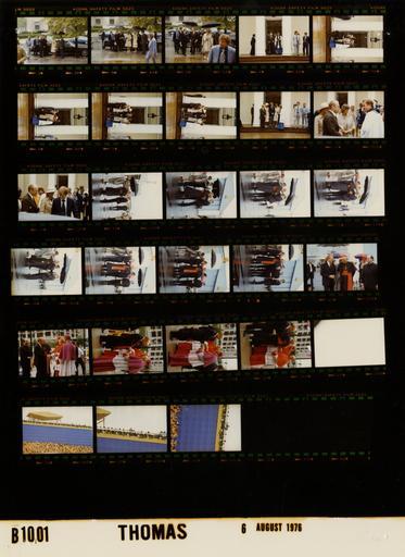 Keywords: Ford B1001 NLGRF photo contact sheet (1976-08-08)(Gerald Ford Library).jpg White House Photographic Office WHPO is housed at the Gerald R Ford Presidential Library a branch of the National Archives and Records Administration NARA <br/><br/> This file is a 200 dpi photo contact sheet having images from roll of film B1001 of the August 9 1974 - January 20 1977 Gerald R Ford White House Photographic Office Series A0001-A9999 and B0001-B2886 photographs <br/><br/> The date on the photo contact sheet is the date the roll of film was processed not necessarily the date the photographs were taken See table below for additional details 1976-08-08 Gerald R Ford Presidential Library Image http //www fordlibrarymuseum gov/library/whphotos/B1001_NLGRF jpg B1001_NLGRF jpg from http //www fordlibrarymuseum gov/library/whphotos/19760808whpo pdf White House Photographs August 8 1976 of the http //www fordlibrarymuseum gov/Library/whphotos/whpo asp White House Photographic Collection page White House Photographic Office WHPO - Thomas PD-USGov Institution Institution Gerald R Ford Presidential Library Table wikitable sortable + Photo contact sheet B1001 U S President Ford Administration Gerald R Ford Library Frame s Tone Subject proper Subject generic Names Geographic Location Photographer Date - 3-5 Color Arrival for Sunday Worship Services Presidential party stepping from limousine; walking toward camera GRF Susan Ford Mike Gayle Ford Secret Service Others Washington DC Lafayette Square - St John's Episcopal Church Thomas 1976-08-08 - 6-13 Color Following Sunday Worship Services walking out door of church; standing talking handshaking; moving toward camera; all not in every frame GRF Susan Ford Mike Gayle Ford Minister Secret Service Others Washington DC Lafayette Square - St John's Episcopal Church Thomas 1976-08-08 - 14-22 Color Trip to Philadelphia PA greeting handshaking standing talking; under umbrellas; all not in every frame GRF Cardinals Kroll Bernardin Mayor Rizzo; Others Philadelphia PA Philadelphia International Airport Thomas 1976-08-08 - 23-26 Color Trip to Philadelphia PA - Prior to 41st International Eucharistic Congress greeting handshaking standing talking GRF Cardinals Cooke Baum; Archbishop Jadot Philadelphia PA The Spectrum - Outside Thomas 1976-08-08 - 27 Color Thomas 1976-08-08 - 28-30 BW Trip to Philadelphia PA - 41st International Eucharistic Congress GRF standing at lectern speaking; low angle shot taken from long distance; faces indiscernible; all not in very frame GRF Cardinals Krol Bernardin Rev Basil Losten Orthodox Clergy Philadelphia PA John F Kennedy Stadium Kennerly 1976-08-08 Gerald R Ford Presidential Library and Museum-cooperation PD-USGov Contact sheets by the Ford White House August 1976 |
