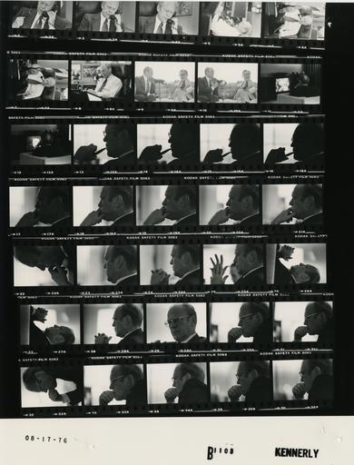 Keywords: Ford B1103 NLGRF photo contact sheet (1976-08-17)(Gerald Ford Library).jpg White House Photographic Office WHPO is housed at the Gerald R Ford Presidential Library a branch of the National Archives and Records Administration NARA <br/><br/> This file is a 200 dpi photo contact sheet having images from roll of film B1103 of the August 9 1974 - January 20 1977 Gerald R Ford White House Photographic Office Series A0001-A9999 and B0001-B2886 photographs <br/><br/> The date on the photo contact sheet is the date the roll of film was processed not necessarily the date the photographs were taken See table below for additional details 1976-08-17 Gerald R Ford Presidential Library Image http //www fordlibrarymuseum gov/library/whphotos/B1103_NLGRF jpg B1103_NLGRF jpg from http //www fordlibrarymuseum gov/library/whphotos/19760817whpo pdf White House Photographs August 17 1976 of the http //www fordlibrarymuseum gov/Library/whphotos/whpo asp White House Photographic Collection page White House Photographic Office WHPO <br/> Creator David Hume Kennerly PD-USGov Institution Institution Gerald R Ford Presidential Library Table wikitable sortable + Photo contact sheet B1103 U S President Ford Administration Gerald R Ford Library Frame s Tone Subject proper Subject generic Names Geographic Location Photographer Date - 2A-4A BW Trip to Kansas City Missouri - Convention seated talking on telephone; close up GRF Kansas City MO Crown Center Hotel - President's Suite -Office Kennerly 1976-08-17 - 5A-8A BW Trip to Kansas City Missouri - Convention seated at desk reading writing; smoking pipe; coatless GRF Kansas City MO Kennerly 1976-08-17 - 9A-10A BW Trip to Kansas City Missouri - Convention - Meeting with Chairman of the New York Republican State Committee seated on sofa talking GRF Rockefeller Kansas City MO Crown Center Hotel - President's Suite Kennerly 1976-08-17 - 11A-12A BW Trip to Kansas City Missouri - Convention seated watching televised convention coverage; smoking holding pipe; taken in silhouette over left shoulder GRF Kansas City MO Crown Center Hotel - President's Suite Kennerly 1976-08-17 - 13A-36A BW Trip to Kansas City Missouri - Convention head and shoulder left side close up portraits; smoking pipe wearing glasses in some frames GRF Kansas City MO Crown Center Hotel - President's Suite Kennerly 1976-08-17 Gerald R Ford Presidential Library and Museum-cooperation PD-USGov Contact sheets by the Ford White House August 1976 Photographs by David Hume Kennerly from 1976 |