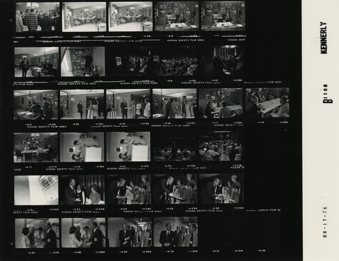 Keywords: Ford B1108 NLGRF photo contact sheet (1976-08-17)(Gerald Ford Library).jpg White House Photographic Office WHPO is housed at the Gerald R Ford Presidential Library a branch of the National Archives and Records Administration NARA <br/><br/> This file is a 200 dpi photo contact sheet having images from roll of film B1108 of the August 9 1974 - January 20 1977 Gerald R Ford White House Photographic Office Series A0001-A9999 and B0001-B2886 photographs <br/><br/> The date on the photo contact sheet is the date the roll of film was processed not necessarily the date the photographs were taken See table below for additional details 1976-08-17 Gerald R Ford Presidential Library Image http //www fordlibrarymuseum gov/library/whphotos/B1108_NLGRF jpg B1108_NLGRF jpg from http //www fordlibrarymuseum gov/library/whphotos/19760817whpo pdf White House Photographs August 17 1976 of the http //www fordlibrarymuseum gov/Library/whphotos/whpo asp White House Photographic Collection page White House Photographic Office WHPO <br/> Creator David Hume Kennerly PD-USGov Institution Institution Gerald R Ford Presidential Library Table wikitable sortable + Photo contact sheet B1108 U S President Ford Administration Gerald R Ford Library Frame s Tone Subject proper Subject generic Names Geographic Location Photographer Date - 1-3 BW Trip to Kansas City Missouri - Convention - Meeting with Ford Regional Whips for the Republican National Convention standing talking in 1st frame; seated around table talking in others; all may not be in frames GRF R Rosenbaum F Biebel E Hillman T Kean R Ogilvie E Welden K McGough K McNamara W McGlaughlin T Milligan R Forsythe Sens Fong Beall Griffin Tower; Rep Michel; Baker White Timmons C Coray Morton Kansas City MO Crown Center Hotel - President's Suite - Office Kennerly 1976-08-17 - 4-7 BW Trip to Kansas City Missouri - Convention seateed behind desk; talking on telephone; Cheney lighting cigarette in 1 frame GRF Cheney Kansas City MO Crown Center Hotel - President's Suite -Office Kennerly 1976-08-17 - 8-10 BW Trip to Kansas City Missouri - Convention - Meeting with State and Regional Floor Whips for the Republican National Convention GRF at lectern speaking others seated; various angles and distances; all not in frames GRF State Regional Floor Whips Kansas City MO Center Hotel -Centennial Room A Kennerly 1976-08-17 - 11 BW Trip to Kansas City Missouri - Convention standing talking near desk GRF O'Donnell Kansas City MO Crown Center Hotel - President's Suite - Office Kennerly 1976-08-17 - 12-14 BW Trip to Kansas City Missouri - Convention - Meeting with Mississippi Delegates and Alternates to the Republican National Convention greeting handshaking; all not in frames GRF W Dease G Beal D K Shanks J T Long J L Baker J K Green J Monsour; James Baker Kansas City MO Crown Center Hotel - President's Suite - Office Kennerly 1976-08-17 - 15-16 BW Trip to Kansas City Missouri - Convention - Meeting with Mississippi Delegates and Alternates to the Republican National Convention seated around table; all may not be in frames GRF W Dease G Beal D K Shanks J T Long J L Baker J K Green J Monsour; James Baker Kansas City MO Crown Center Hotel - President's Suite - Office Kennerly 1976-08-17 - 17 BW Trip to Kansas City Missouri - Convention - Convention Strategy Meeting seated around table GRF Hartmann Orben Penny Douglas Smith Kansas City MO Crown Center Hotel - President's Suite - Office Kennerly 1976-08-17 - 18-19 BW Trip to Kansas City Missouri - Convention talking; O'Donnell seated at desk; man kneeling on floor in front of desk O'Donnell Unidentified Man Kansas City MO Crown Center Hotel - President's Suite Kennerly 1976-08-17 - 20-21 BW Trip to Kansas City Missouri - Convention - Delegates and Alternates from Illinois to the Republican National Convention GRF at lectern speaking others in foreground; long shot from back of room GRF Delegates Alternates from Illinois Kansas City MO Hilton Plaza Inn - Regency Room Kennerly 1976-08-17 - 22 BW Kennerly 1976-08-17 - 23-26 BW Trip to Kansas City Missouri - Convention - Delegates and Alternates from Illinois to the Republican National Convention standing talking to small groups; all not in frames GRF Delegates Alternates from Illinois Kansas City MO Hilton Plaza Inn - Regency Room Kennerly 1976-08-17 - 27-28 BW Trip to Kansas City Missouri - Convention standing talking handshaking GRF Unidentified women Kansas City MO Hilton Plaza Inn Kennerly 1976-08-17 - 29-30 BW Trip to Kansas City Missouri - Convention walking through steam tunnel GRF Nessen Others Kansas City MO Hilton Plaza Inn Kennerly 1976-08-17 Gerald R Ford Presidential Library and Museum-cooperation PD-USGov Contact sheets by the Ford White House August 1976 Photographs by David Hume Kennerly from 1976