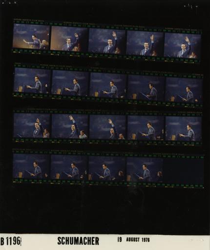 | Keywords: Ford B1196 NLGRF photo contact sheet (1976-08-19)(Gerald Ford Library).jpg White House Photographic Office WHPO is housed at the Gerald R Ford Presidential Library a branch of the National Archives and Records Administration NARA <br/><br/> This file is a 200 dpi photo contact sheet having images from roll of film B1196 of the August 9 1974 - January 20 1977 Gerald R Ford White House Photographic Office Series A0001-A9999 and B0001-B2886 photographs <br/><br/> The date on the photo contact sheet is the date the roll of film was processed not necessarily the date the photographs were taken See table below for additional details 1976-08-19 Gerald R Ford Presidential Library Image http //www fordlibrarymuseum gov/library/whphotos/B1196_NLGRF jpg B1196_NLGRF jpg from http //www fordlibrarymuseum gov/library/whphotos/19760819whpo pdf White House Photographs August 19 1976 of the http //www fordlibrarymuseum gov/Library/whphotos/whpo asp White House Photographic Collection page White House Photographic Office WHPO - Schumacher PD-USGov Institution Institution Gerald R Ford Presidential Library Table wikitable sortable + Photo contact sheet B1196 U S President Ford Administration Gerald R Ford Library Frame s Tone Subject proper Subject generic Names Geographic Location Photographer Date - 9-27 Color Trip to Kansas City Missouri - Convention - Remarks of Vice President-Designate at the 5th Session of the Republican National Convention standing at lectern speaking; waving in some frames; medium range from left; interpretor for hearing impaired in some frames Dole Interpretor Kansas City MO Kemper Arena - Podium Schumacher 1976-08-19 Gerald R Ford Presidential Library and Museum-cooperation PD-USGov Contact sheets by the Ford White House August 1976 |