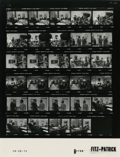 | Keywords: Ford B1733 NLGRF photo contact sheet (1976-10-01)(Gerald Ford Library).jpg White House Photographic Office WHPO is housed at the Gerald R Ford Presidential Library a branch of the National Archives and Records Administration NARA <br/><br/> This file is a 200 dpi photo contact sheet having images from roll of film B1733 of the August 9 1974 - January 20 1977 Gerald R Ford White House Photographic Office Series A0001-A9999 and B0001-B2886 photographs <br/><br/> The date on the photo contact sheet is the date the roll of film was processed not necessarily the date the photographs were taken See table below for additional details 1976-10-01 Gerald R Ford Presidential Library Image http //www fordlibrarymuseum gov/library/whphotos/B1733_NLGRF jpg B1733_NLGRF jpg from http //www fordlibrarymuseum gov/library/whphotos/19761001whpo pdf White House Photographs October 1 1976 of the http //www fordlibrarymuseum gov/Library/whphotos/whpo asp White House Photographic Collection page White House Photographic Office WHPO - Fitz-Patrick PD-USGov Institution Institution Gerald R Ford Presidential Library Table wikitable sortable + Photo contact sheet B1733 U S President Ford Administration Gerald R Ford Library Frame s Tone Subject proper Subject generic Names Geographic Location Photographer Date - 2-4 BW United States Senator from Arizona AZ seated around desk talking; taken from right of GRF GRF Sen Fannin Oval Office Fitz-Patrick 1976-10-01 - 5-7 BW Visit of the Minister of Foreign Affairs of the French Republic not shown standing facing fireplace not seen ; some holding film cameras Media Oval Office Fitz-Patrick 1976-10-01 - 8-9 BW Minister of Foreign Affairs of the French Republic; Ambassador of France to the United States GRF and de Guiringaud seated near fireplace; others on sofas; taken between shoulders of media in foreground GRF Louis de Guiringaud; Jacques Kosciusko-Morizet; Kissinger Scowcroft; Media Oval Office Fitz-Patrick 1976-10-01 - 10-11 BW standing talking GRF Unidentified Man Oval Office Fitz-Patrick 1976-10-01 - 17-21 BW Meeting with Members of the President Ford Committee PFC Advisory Committee on Ethnic Affairs GRF standing speaking at lectern; others seated in foreground; taken from rear and right of GRF; all not in frames GRF Members of the President Ford Committee PFC Advisory Committee on Ethnic Affairs State Dining Room Fitz-Patrick 1976-10-02 - 22-25 BW Republican Candidate in the Fifth Congressional District of Michigan greeting handshaking talking GRF Harold Sawyer Oval Office Fitz-Patrick 1976-10-02 - 26-30 BW Republican Candidate in the Fifth Congressional District of Michigan various angles and distances GRF Harold Sawyer Oval Office Fitz-Patrick 1976-10-02 Gerald R Ford Presidential Library and Museum-cooperation PD-USGov Contact sheets by the Ford White House October 1976 |