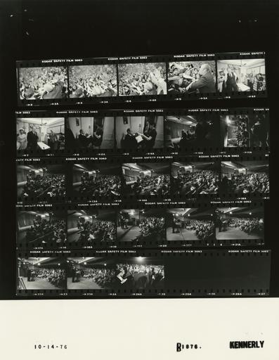 Keywords: Ford B1876 NLGRF photo contact sheet (1976-10-13)(Gerald Ford Library).jpg White House Photographic Office WHPO is housed at the Gerald R Ford Presidential Library a branch of the National Archives and Records Administration NARA <br/><br/> This file is a 200 dpi photo contact sheet having images from roll of film B1876 of the August 9 1974 - January 20 1977 Gerald R Ford White House Photographic Office Series A0001-A9999 and B0001-B2886 photographs <br/><br/> The date on the photo contact sheet is the date the roll of film was processed not necessarily the date the photographs were taken See table below for additional details 1976-10-13 Gerald R Ford Presidential Library Image http //www fordlibrarymuseum gov/library/whphotos/B1876_NLGRF jpg B1876_NLGRF jpg from http //www fordlibrarymuseum gov/library/whphotos/19761013whpo pdf White House Photographs October 13 1976 of the http //www fordlibrarymuseum gov/Library/whphotos/whpo asp White House Photographic Collection page White House Photographic Office WHPO <br/> Creator David Hume Kennerly PD-USGov Institution Institution Gerald R Ford Presidential Library Table wikitable sortable + Photo contact sheet B1876 U S President Ford Administration Gerald R Ford Library Frame s Tone Subject proper Subject generic Names Geographic Location Photographer Date - 2A-5A BW Campaign Trip to New Jersey; Campaign Rally in Union - Union New Jersey greeting handshaking; various angles; all not in every frame GRF Crowd Union NJ Town and Campus Inn - Outside Kennerly 1976-10-13 - 6A-7A BW Following Swine Flu Inoculation; President's Personal Physician GRF putting suit cooat on; others nearby GRF Lukash Nurse Lukash's Office Kennerly 1976-10-14 - 8A-9A BW Prior to 38th Press Conference GRF seated; woman talking to GRF; agent in background GRF Secret Service Agent Woman Washington DC Old Executive Office Building OEOB -Holding Room Kennerly 1976-10-14 - 10A-24A BW 38th Press Conference GRF at lectern speaking; various angles and distances; all not in every frame GRF Media Washington DC Old Executive Office Building OEOB -Room 450 Kennerly 1976-10-14 Gerald R Ford Presidential Library and Museum-cooperation PD-USGov Contact sheets by the Ford White House October 1976 Photographs by David Hume Kennerly from 1976 |