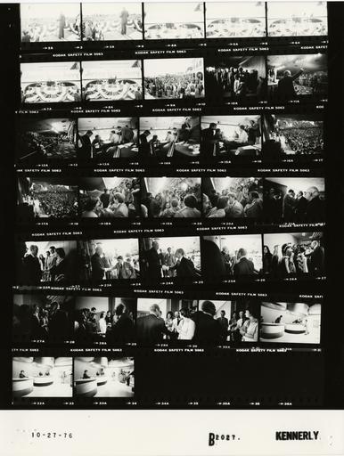 | Keywords: Ford B2027 NLGRF photo contact sheet (1976-10-27)(Gerald Ford Library).jpg White House Photographic Office WHPO is housed at the Gerald R Ford Presidential Library a branch of the National Archives and Records Administration NARA <br/><br/> This file is a 200 dpi photo contact sheet having images from roll of film B2027 of the August 9 1974 - January 20 1977 Gerald R Ford White House Photographic Office Series A0001-A9999 and B0001-B2886 photographs <br/><br/> The date on the photo contact sheet is the date the roll of film was processed not necessarily the date the photographs were taken See table below for additional details 1976-10-27 Gerald R Ford Presidential Library Image http //www fordlibrarymuseum gov/library/whphotos/B2027_NLGRF jpg B2027_NLGRF jpg from http //www fordlibrarymuseum gov/library/whphotos/19761027whpo pdf White House Photographs October 27 1976 of the http //www fordlibrarymuseum gov/Library/whphotos/whpo asp White House Photographic Collection page White House Photographic Office WHPO <br/> Creator David Hume Kennerly PD-USGov Institution Institution Gerald R Ford Presidential Library Table wikitable sortable + Photo contact sheet B2027 U S President Ford Administration Gerald R Ford Library Frame s Tone Subject proper Subject generic Names Geographic Location Photographer Date - 2A-9A BW Campaign Trip to New Jersey - Rally on the Boardwalk Atlantic City GRF at lectern speaking; various angles and distances; all not in every frame GRF Howard Haneman Joseph Lazarow Miss America Dorothy Benham Alfred Mr Marks Crowd Atlantic City NJ Haddon Hall Hotel - Boardwalk in Front Kennerly 1976-10-27 - 10A BW Campaign Trip to New Jersey - Prior to 24th Annual New Jersey School Boards Association Convention standing posing; backlit GRF Unidentified Man Boy Atlantic City NJ Haddon Hall Hotel - Holding Room Kennerly 1976-10-27 - 11A-12A BW Campaign Trip to New Jersey - 24th Annual New Jersey School Boards Association Convention GRF entering room waving in 1st frame; speaking from stage in 2nd frame; long shots from left of stage GRF New Jersey School Boards Association Members Atlantic City NJ Haddon Hall Hotel - Pennsylvania Ballroom Kennerly 1976-10-27 - 13A-15A BW Flight from Atlanto City New Jersey to Philadelphia PA seated standing around table; talking; all not in every frame Cheney Cavaney Hyland Ingersoll Schneider Others Air Force One Kennerly 1976-10-27 - 16A-17A BW Campaign Trip to Pennsylvania; Rally at Villanova University - Villanova Pennsylvania GRF at lectern speaking; higher vantage point long shots from right of stage GRF J Cleary A Donato Sen Schweiker Rev J Driscoll J Nolan Jack Ford Rep Schulze Fr Deegan; Crowd Villanova PA Villanova University Fieldhouse Kennerly 1976-10-27 - 18A-20A BW Campaign Trip to Pennsylvania; Following Rally at Villanova University - Villanova Pennsylvania greeting handshaking talking; Jack kissing coed in frame 20A Jack Ford Students Villanova PA Villanova University Fieldhouse Kennerly 1976-10-27 - 21A-22A BW Campaign Trip to Pennsylvania; Meeting with Villanova University Student Leaders - Villanova Pennsylvania standing talking greeting handshaking; all not in frames GRF Rev Driscoll Villanova Student Leaders; Others Villanova PA Villanova University Fieldhouse - Holding Rooms A B Kennerly 1976-10-27 - 23A-25A BW Campaign Trip to Pennsylvania - Prior to Meeting with Head of the Archdiocese of Philadelphia greeting handshaking; GRF and Jack not in every frame GRF Jack Ford John Cardinal Krol Philadelphia PA Cardinal Krol's Residence - Outside Kennerly 1976-10-27 - 26A-30A BW Campaign Trip to Pennsylvania - Prior to WPVI-TV Interview greeting handshaking talking; all not in every frame GRF Others Philadelphia PA WPVI-TV Studios Kennerly 1976-10-27 - 31A-33A BW Campaign Trip to Pennsylvania - WPVI-TV Interview GRF and Kane doing interview; Pellegrino seated to side; long shots from right of GRF GRF Larry Kane Joe Pellegrino; Technicians Philadelphia PA WPVI-TV Studios - Studio 1 Kennerly 1976-10-27 Gerald R Ford Presidential Library and Museum-cooperation PD-USGov Contact sheets by the Ford White House October 1976 Photographs by David Hume Kennerly from 1976 |