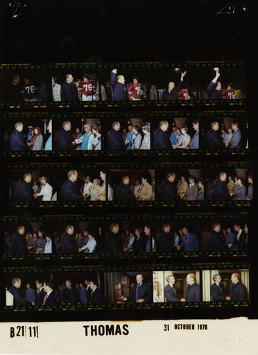 | Keywords: Ford B2111 NLGRF photo contact sheet (1976-10-29)(Gerald Ford Library).jpg White House Photographic Office WHPO is housed at the Gerald R Ford Presidential Library a branch of the National Archives and Records Administration NARA <br/><br/> This file is a 200 dpi photo contact sheet having images from roll of film B2111 of the August 9 1974 - January 20 1977 Gerald R Ford White House Photographic Office Series A0001-A9999 and B0001-B2886 photographs <br/><br/> The date on the photo contact sheet is the date the roll of film was processed not necessarily the date the photographs were taken See table below for additional details 1976-10-29 Gerald R Ford Presidential Library Image http //www fordlibrarymuseum gov/library/whphotos/B2111_NLGRF jpg B2111_NLGRF jpg from http //www fordlibrarymuseum gov/library/whphotos/19761029whpo pdf White House Photographs October 29 1976 of the http //www fordlibrarymuseum gov/Library/whphotos/whpo asp White House Photographic Collection page White House Photographic Office WHPO - Thomas PD-USGov Institution Institution Gerald R Ford Presidential Library Table wikitable sortable + Photo contact sheet B2111 U S President Ford Administration Gerald R Ford Library Frame s Tone Subject proper Subject generic Names Geographic Location Photographer Date - 4-8 Color Campaign Trip to Texas - Attending Robert E Lee High School v MacArthur High School Football Game greeting standing talking in 1st 3 frames; GRF waving player in background in last 2 frames GRF High School Football Player Aldine TX Stallworth Stadium Thomas 1976-10-29 - 9-26 Color Campaign Trip to Texas - Following Robert E Lee High School v MacArthur High School Football Game greeting handshaking other the grandstands; all not in every frame GRF Others Aldine TX Stallworth Stadium Thomas 1976-10-29 - 27-28 Color Campaign Trip to Texas - Overnight stay Houston Marriott GRF and man handshaking; Baker on left of frame GRF James Baker Unidentified Man Houston TX Houston Marriott Hotel Thomas 1976-10-29 Gerald R Ford Presidential Library and Museum-cooperation PD-USGov Contact sheets by the Ford White House October 1976 |