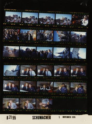 Keywords: Ford B2155 NLGRF photo contact sheet (1976-11-01)(Gerald Ford Library).jpg White House Photographic Office WHPO is housed at the Gerald R Ford Presidential Library a branch of the National Archives and Records Administration NARA <br/><br/> This file is a 200 dpi photo contact sheet having images from roll of film B2155 of the August 9 1974 - January 20 1977 Gerald R Ford White House Photographic Office Series A0001-A9999 and B0001-B2886 photographs <br/><br/> The date on the photo contact sheet is the date the roll of film was processed not necessarily the date the photographs were taken See table below for additional details 1976-11-01 Gerald R Ford Presidential Library Image http //www fordlibrarymuseum gov/library/whphotos/B2155_NLGRF jpg B2155_NLGRF jpg from http //www fordlibrarymuseum gov/library/whphotos/19761101whpo pdf White House Photographs November 1 1976 of the http //www fordlibrarymuseum gov/Library/whphotos/whpo asp White House Photographic Collection page White House Photographic Office WHPO - Schumacher PD-USGov Institution Institution Gerald R Ford Presidential Library Table wikitable sortable + Photo contact sheet B2155 U S President Ford Administration Gerald R Ford Library Frame s Tone Subject proper Subject generic Names Geographic Location Photographer Date - 1A-4A Color Betty Ford Campaign Trip to Pennsylvania - PFC Rally Prior to Departure for Michigan BF Connors and others on platform; band in foreground large S on back red uniforms; terminal in background; balloons being released upward; long shots Betty Ford Chuck Connors Crowd Unidentified Marching Band Harrisburg PA Harrisburg Capitol City Airport Schumacher 1976-11-01 - 5A Color Betty Ford Campaign Trip to Pennsylvania - PFC Rally Prior to Departure for Michigan - Actor greeting handshaking; taken from higher vantage point Chuck Connors Crowd Harrisburg PA Harrisburg Capitol City Airport Schumacher 1976-11-01 - 6A Color Betty Ford Campaign Trip to Pennsylvania - PFC Rally Prior to Departure for Michigan greeting handshaking; taken from higher vantage point Betty Ford Crowd; Secret Service Harrisburg PA Harrisburg Capitol City Airport Schumacher 1976-11-01 - 7A-9A Color Betty Ford Campaign Trip to Pennsylvania - PFC Rally Prior to Departure for Michigan BF speaking; hangar on right of frame Betty Ford Crowd; Secret Service Harrisburg PA Harrisburg Capitol City Airport Schumacher 1976-11-01 - 10A-13A Color Betty Ford Campaign Trip to Pennsylvania - Prior to Departure for Michigan handshaking saying goodbye; Tristar aircraft plane in all but last frame Betty Ford Others Harrisburg PA Harrisburg Capitol City Airport Schumacher 1976-11-01 - 14A-16A Color Betty Ford Campaign Trip to Pennsylvania - Prior to Departure for Michigan standing waving in doorway of Tristar aircraft plane ; taken from lower vantage point Betty Ford Harrisburg PA Harrisburg Capitol City Airport Schumacher 1976-11-01 - 17A-22A Color Flight to Detroit Michigan seated at table posing; two shots each of BF with individuals Betty Ford; Three Plane Air Force Personnel Aboard Tri-Star Aircraft plane Schumacher 1976-11-01 - 23A Color Flight to Detroit Michigan walking down aisle; waving arms Betty Ford Aboard Tri-Star Aircraft plane Schumacher 1976-11-01 - 24A-25A Color Flight to Detroit Michigan standing posing Betty Ford Unidentified Air Force Crewman Aboard Tri-Star Aircraft plane Schumacher 1976-11-01 - 26A-28A Color Flight to Detroit Michigan - Actor standing posing; arm-in-arm Betty Ford Chuck Connors Aboard Tri-Star Aircraft plane Schumacher 1976-11-01 Gerald R Ford Presidential Library and Museum-cooperation PD-USGov Contact sheets by the Ford White House November 1976 |