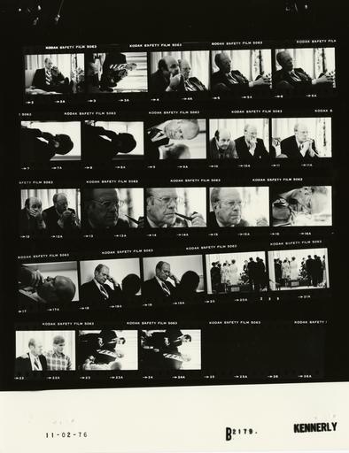 Keywords: Ford B2179 NLGRF photo contact sheet (1976-11-02)(Gerald Ford Library).jpg White House Photographic Office WHPO is housed at the Gerald R Ford Presidential Library a branch of the National Archives and Records Administration NARA <br/><br/> This file is a 200 dpi photo contact sheet having images from roll of film B2179 of the August 9 1974 - January 20 1977 Gerald R Ford White House Photographic Office Series A0001-A9999 and B0001-B2886 photographs <br/><br/> The date on the photo contact sheet is the date the roll of film was processed not necessarily the date the photographs were taken See table below for additional details 1976-11-02 Gerald R Ford Presidential Library Image http //www fordlibrarymuseum gov/library/whphotos/B2179_NLGRF jpg B2179_NLGRF jpg from http //www fordlibrarymuseum gov/library/whphotos/19761102whpo pdf White House Photographs November 2 1976 of the http //www fordlibrarymuseum gov/Library/whphotos/whpo asp White House Photographic Collection page White House Photographic Office WHPO <br/> Creator David Hume Kennerly PD-USGov Institution Institution Gerald R Ford Presidential Library Table wikitable sortable + Photo contact sheet B2179 U S President Ford Administration Gerald R Ford Library Frame s Tone Subject proper Subject generic Names Geographic Location Photographer Date - 2A-6A BW Election Night Activities GRF seated on sofa watching TV not seen and smoking pipe; Garagiola hand on chin in frame 4A only; close ups GRF Joe Garagiola Second Floor - West Sitting Room Kennerly 1976-11-02 - 7A-8A BW Election Night Activities standing talking on telephone; head and shoulders silhouette close up portrait GRF Second Floor - West Sitting Room Kennerly 1976-11-02 - 9A BW Election Night Activities standing talking; Javits in foreground; head and shoulder portrait GRF Sen Javits Second Floor - West Sitting Room Kennerly 1976-11-02 - 10A-12A BW Election Night Activities seated on sofa watching TV not seen ; GRF lighting pipe in last frame; Garagiola grimacing in 1st and 3rd frames; close ups GRF Joe Garagiola Second Floor - West Sitting Room Kennerly 1976-11-02 - 13A-17A BW Election Night Activities holding smoking pipe; glasses removed in last frame; various angles; close up portraits GRF Second Floor - West Sitting Room Kennerly 1976-11-02 - 18A-19A BW Election Night Activities seated leaning on hand on side of head; silhouette Teeter in foreground GRF Second Floor - West Sitting Room Kennerly 1976-11-02 - 20A-21A BW Election Night Activities GRF standing in center talking; others standing seated in circle; all not in frames Betty Ford Pearl Bailey Weidenfeld E Weidenfeld Pullen Parma Elizabeth Dole Mike Ford Clara Powell Susan Ford Beau Firth Nancy Gordon Others Second Floor - West Sitting Room Kennerly 1976-11-02 - 22A BW Election Night Activities standing somber expressions; Steve's right arm over GRF's shoulders GRF Steve Ford Second Floor - West Sitting Room Kennerly 1976-11-02 - 23A-24A BW Election Night Activities standing talking; GRF's right arm over Dole's shoulders in 1st frame GRF Dole Second Floor - West Sitting Room Kennerly 1976-11-02 Gerald R Ford Presidential Library and Museum-cooperation PD-USGov Contact sheets by the Ford White House November 1976 Photographs by David Hume Kennerly from 1976 |