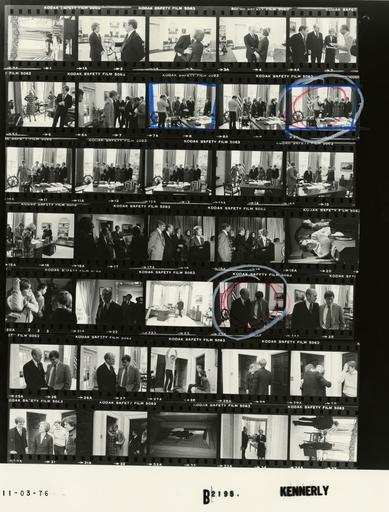| Keywords: Ford B2195 NLGRF photo contact sheet (1976-11-03)(Gerald Ford Library).jpg White House Photographic Office WHPO is housed at the Gerald R Ford Presidential Library a branch of the National Archives and Records Administration NARA <br/><br/> This file is a 200 dpi photo contact sheet having images from roll of film B2195 of the August 9 1974 - January 20 1977 Gerald R Ford White House Photographic Office Series A0001-A9999 and B0001-B2886 photographs <br/><br/> The date on the photo contact sheet is the date the roll of film was processed not necessarily the date the photographs were taken See table below for additional details 1976-11-03 Gerald R Ford Presidential Library Image http //www fordlibrarymuseum gov/library/whphotos/B2195_NLGRF jpg B2195_NLGRF jpg from http //www fordlibrarymuseum gov/library/whphotos/19761103whpo pdf White House Photographs November 3 1976 of the http //www fordlibrarymuseum gov/Library/whphotos/whpo asp White House Photographic Collection page White House Photographic Office WHPO <br/> Creator David Hume Kennerly PD-USGov Institution Institution Gerald R Ford Presidential Library Table wikitable sortable + Photo contact sheet B2195 U S President Ford Administration Gerald R Ford Library Frame s Tone Subject proper Subject generic Names Geographic Location Photographer Date - 1 BW Prior to Making Congratulatory Telephone Call to Jimmy Carter seated at desk reading documents GRF Oval Office Kennerly 1976-11-03 - 2 BW Prior to Ford Family Meeting Media on Morning After General Election standing talking Betty Ford Cheney Oval Office Kennerly 1976-11-03 - 3-4 BW Prior to Ford Family Meeting Media on Morning After General Election kissing embracing GRF Betty Ford Oval Office Kennerly 1976-11-03 - 5 BW Prior to Ford Family Meeting Media on Morning After General Election standing talking; Nessen holding large folder of documents reading from file card GRF Betty Ford Ceney Nessen Oval Office Kennerly 1976-11-03 - 6 BW Prior to Ford Family Meeting Media on Morning After General Election Mike in foreground; Susan and Gayle backs to camera looking at photographs and objects on credenza behind desk Susan Ford Mike Gayle Ford Oval Office Kennerly 1976-11-03 - 7 BW Prior to Ford Family Meeting Media on Morning After General Election standing in group near desk; all not in frame GRF Betty Ford Mike Ford Gayle Ford Steve Ford Susan Ford Jack Ford; Cheney Nessen Oval Office Kennerly 1976-11-03 - 8-9 BW Prior to Ford Family Meeting Media on Morning After General Election moving into positions behind desk for family portrait GRF Betty Ford Mike Ford Gayle Ford Steve Ford Susan Ford Jack Ford Oval Office Kennerly 1976-11-03 - 10 BW Prior to Ford Family Meeting Media on Morning After General Election standing behind desk; BF putting hand under Jack's chin GRF Betty Ford Mike Ford Gayle Ford Steve Ford Susan Ford Jack Ford Oval Office Kennerly 1976-11-03 - 11-13 BW Prior to Ford Family Meeting Media on Morning After General Election standing posing behind desk for family portrait GRF Betty Ford Mike Ford Gayle Ford Steve Ford Susan Ford Jack Ford Oval Office Kennerly 1976-11-03 - 14-16 BW Prior to Ford Family Meeting Media on Morning After General Election moving around behind and in front of desk following family portrait; all not in every frame GRF Betty Ford Mike Ford Gayle Ford Steve Ford Susan Ford Jack Ford Oval Office Kennerly 1976-11-03 - 17 BW Prior to Ford Family Meeting Media on Morning After General Election standing talking smiling GRF Betty Ford Scowcroft Others Scheduling and Advance Office Kennerly 1976-11-03 - 18-19 BW Ford Family Meeting Media on Morning After General Election BF at lectern speaking; others on left of frame; BF and GRF' handshaking in 2nd frame GRF Betty Ford Mike Ford Gayle Ford Steve Ford Susan Ford Jack Ford Press Briefing Area Kennerly 1976-11-03 - 20-21 BW Ford Family Meeting Media on Morning After General Election leaning on lectern talking Jack Ford Press Briefing Area Kennerly 1976-11-03 - 22 BW Following Meeting with Media on Morning After General Election walking back toward Oval Office not seen GRF Others White House Hallway Kennerly 1976-11-03 - 23 BW Following Meeting with Media on Morning After General Election walking back to camera around desk to chair; long shot GRF Oval Office Kennerly 1976-11-03 - 24-27 BW Following Meeting with Media on Morning After General Election standing talking; GRF's arm around TO's back in 1st 2 frames; close ups GRF O'Donnell Oval Office Kennerly 1976-11-03 - 28 BW Prior to Returning to Oval Office talking; Jack jumping hands over head Mike and Gayle seated on sofa Jack Ford Mike Gayle Ford Scheduling and Advance Office Kennerly 1976-11-03 - 29-30 BW Prior to Returning to Oval Office BF embracing boys individually in each frame Betty Ford Jack Ford Mike Ford Scheduling and Advance Office Kennerly 1976-11-03 - 31 BW Prior to Returning to Oval Office standing talking Betty Ford Jack Ford Mike Ford Gayle Ford Scheduling and Advance Office Kennerly 1976-11-03 - 32 BW Prior to Returning to Oval Office Steve and Susan embracing on left; others standing to side Susan Ford Steve Ford White House staff Scheduling and Advance Office Kennerly 1976-11-03 - 33 BW walking through doorway into Oval Office; back to camera Betty Ford Scheduling and Advance Office Kennerly 1976-11-03 - 34 BW standing talking in doorway from Scheduling and Advance Office GRF Betty Ford Oval Office Kennerly 1976-11-03 - 35 BW walking toward desk backs to camera; GRF with hand in left pocket leaning over desk GRF Mike Ford Oval Office Kennerly 1976-11-03 Gerald R Ford Presidential Library and Museum-cooperation PD-USGov Contact sheets by the Ford White House November 1976 Photographs by David Hume Kennerly from 1976 |