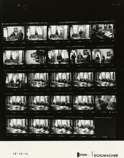 | Keywords: Ford B2525 NLGRF photo contact sheet (1976-12-15)(Gerald Ford Library).jpg White House Photographic Office WHPO is housed at the Gerald R Ford Presidential Library a branch of the National Archives and Records Administration NARA <br/><br/> This file is a 200 dpi photo contact sheet having images from roll of film B2525 of the August 9 1974 - January 20 1977 Gerald R Ford White House Photographic Office Series A0001-A9999 and B0001-B2886 photographs <br/><br/> The date on the photo contact sheet is the date the roll of film was processed not necessarily the date the photographs were taken See table below for additional details 1976-12-15 Gerald R Ford Presidential Library Image http //www fordlibrarymuseum gov/library/whphotos/B2525_NLGRF jpg B2525_NLGRF jpg from http //www fordlibrarymuseum gov/library/whphotos/19761215whpo pdf White House Photographs December 15 1976 of the http //www fordlibrarymuseum gov/Library/whphotos/whpo asp White House Photographic Collection page White House Photographic Office WHPO - Schumacher PD-USGov Institution Institution Gerald R Ford Presidential Library Table wikitable sortable + Photo contact sheet B2525 U S President Ford Administration Gerald R Ford Library Frame s Tone Subject proper Subject generic Names Geographic Location Photographer Date - 1A BW Prior to National Security Council NSC Meeting standing near table; Cheney leaning on back of chair; others talking Cheney Clements Rumsfeld Cabinet Room Schumacher 1976-12-15 - 2A BW Prior to National Security Council NSC Meeting standing near table leaning on back of chair Kissinger Cabinet Room Schumacher 1976-12-15 - 3A-4A BW Prior to National Security Council NSC Meeting standing talking near table Kissinger Scowcroft Cabinet Room Schumacher 1976-12-15 - 5A BW Prior to National Security Council NSC Meeting seated at table reading documents Gen Brown Cabinet Room Schumacher 1976-12-15 - 6A BW Prior to National Security Council NSC Meeting standing talking near table Kissinger Scowcroft Cabinet Room Schumacher 1976-12-15 - 7A BW Prior to National Security Council NSC Meeting standing laughing near table; Lynn's back to camera Cheney Clements Lynn Cabinet Room Schumacher 1976-12-15 - 8A BW Prior to National Security Council NSC Meeting HAK and BS standing talking in background; Rumsfeld standing in foreground smoking pipe Kissinger Scowcroft Rumsfeld Cabinet Room Schumacher 1976-12-15 - 9A BW Prior to National Security Council NSC Meeting standing talking; Rumsfeld smoking pipe Cheney Clements Rumsfeld Cabinet Room Schumacher 1976-12-15 - 10A BW Prior to National Security Council NSC Meeting standing near table; GRF carrying stack of papers under arm Rumsfeld GRF Lynn Cabinet Room Schumacher 1976-12-15 - 11A BW Prior to National Security Council NSC Meeting taking seats; GRF carrying stack of papers under arm GRF Kissinger Scowcroft Clements Cabinet Room Schumacher 1976-12-15 - 12A-24A BW National Security Council NSC Meeting seated at table; various angles and distances; Clements not in every frame GRF Kissinger Rumsfeld Clements Cabinet Room Schumacher 1976-12-15 Gerald R Ford Presidential Library and Museum-cooperation PD-USGov Contact sheets by the Ford White House December 1976 |