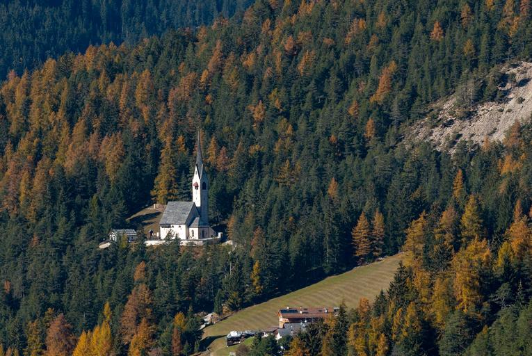 Keywords: forest autumn church st jacob nature fall color october trees golden autumn landscape val gardena dolomites