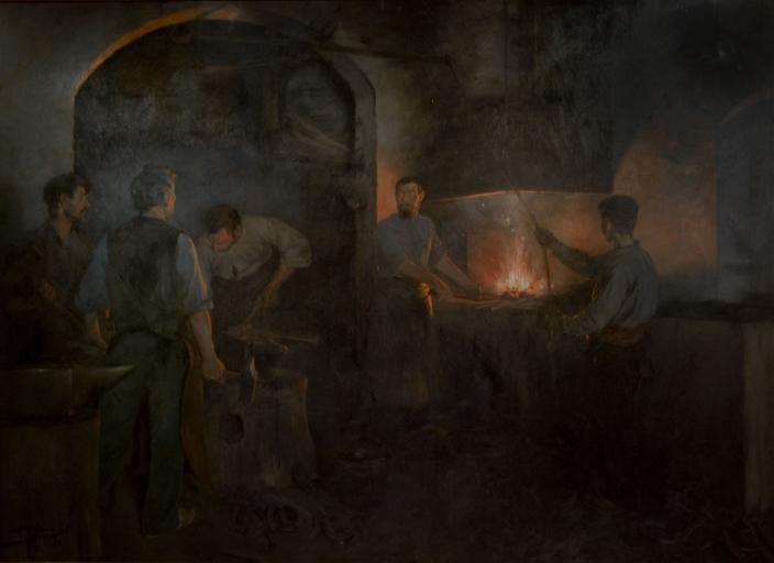 Keywords: Forja o La Ferreria.JPG Artwork Creator Lluís Graner ca Escena d'interior d'una farga amb cinc homes treballant el ferro pel procediment de la forja dos d'ells al forn on es fa l'operació de reduir el mineral i els altres tres al mall forjant between Oil on canvas cm Institution Biblioteca Museu Víctor Balaguer object history exhibition history credit line accession number place of creation Biblioteca Museu Víctor Balaguer-cooperation PD-Art PD-old-100-1923 Uploaded with UploadWizard Paintings in the Biblioteca Museu Víctor Balaguer Mines in unidentified countries Forges Dipòsit del MNAC a la BMVB Lluís Graner |