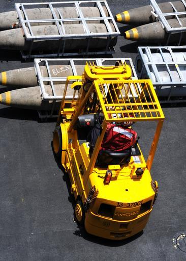 | Keywords: Forklift is moving bombs.jpg A fork-lift operator from aircraft elevator 4 picks up ordnance during a weapons onload aboard the aircraft carrier USS Dwight D Eisenhower CVN 69 http //www navy mil; http //www navy mil/view_image asp id 72282 VIRIN 090529-N-9988F-286 Rafael Figueroa Medina U S Navy 2009-05-25 PD-USGov-Military-Navy Hyster forklifts Aboard USS Dwight D Eisenhower CVN-69 Practice bombs Military forklifts | ||||