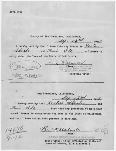 | Keywords: Form 2523 certifying marriage under laws of state of California - NARA - 296472.jpg Scope and content General notes 296472 Local identifier Department of Justice Immigration and Naturalization Service San Francisco District Office - NARA-Place Japan Asia nation 3137128 36 138 <br /> NARA's Pacific Region San Bruno NRHAS 1000 Commodore Drive San Bruno CA 94066-2350 1915-09-23 Record group Record Group 85 Records of the Immigration and Naturalization Service 1787 - 2004 Record group ARC 414 Immigration Arrival Investigation Case Files compiled 1884 - 1944 documenting the period 1882 - ca 1962 Series ARC 296445 File unit Immigration Arrival Investigation case file for Fumi Akashi wife of Kentaro Akashi 1915 - 1915 File unit ARC 296470 Variant control numbers NAIL Control Number NRHS-85-INSSFARRCAS-14676 9 16-2 Other versions <gallery> File Form_2523_certifying_marriage_under_laws_of_state_of_California_-_NARA_-_296472 tif tif File Form_2523_certifying_marriage_under_laws_of_state_of_California_-_NARA_-_296472 jpg jpg </gallery> NARA-cooperation PD-USGov Documents relating to US Immigration and Naturalization Service |