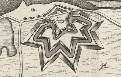 Keywords: Fort Knodsenburg.jpg en Fort Knodsenburg Netherlands nl Fort Knodsenburg detail van plattegrond van Nijmegen ca 1702 17th century/17e eeuws Rijksmuseum Amsterdam author PD-old-100 Fort Knodsenburg