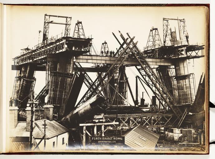 | Keywords: Forth Bridge - Superstructure, Fife, 15 Sept. 1886.jpg Photograph of the Fife superstructure lifting girders and platforms Owing to the fact that the Fife cantilever occurs on the foreshore and is overlooked by rising ground to the north it afforded an opportunity of obtaining certain views not practicable in the case of the other two Not only did its situation admit of perspective effect being duly emphasised but also that of the rectangular form of the structure only apparent when each vertical column is separately defined The cages before referred to are all seen here in position prior to the first lift Up to this level the superstructure was erected by means of ordinary cranes and staging In the vertical columns and at a height of about 30 feet above the surface of the pier a plate was omitted on either side of the same In the gap thus formed were built two box girders having a dimension of about 5 feet by 2 feet Superimposed upon these girders were what were subsequently known as the lifting platrofms - comprised of material destined to be ultimately worked into the permanent structure - and through which the upper ends of the vertical tubes and struts projected The total weight of these four girders and their accessories amounted to about 400 tons the whole being supported by and lifted from the vertical columns in the following manner - Inside each of these columns were constructed two frames the upper side of the one being connected to the lower of the other by means of hydraulic jacks contrived in such a way as to oscillate in a plane at right angles to the centre line of the bridge Through the rigs of the columns holes were drilled at equal distances apart and into these holes steel pins were inserted supporting either frame Everything being ready for a lift the jacks were set in motion the thrust being taken by the lower frames and duly transmitted to the pins At the end of the stroke pins were inserted below the under side of upper frame and the jacks eased whereupon the whole weight of the platform came upon the upper frame the lower one simultaneously drawn up by the closing of the jacks and secured by pins being at once in readiness for another lift The rate of progress was to a large extent governed by the weather but under favourable circumstances it was extremely rapid as many as three lifts having been effected in eight days and the necessary riveting accomplished in the cages attached The tension girder connecting the vertical columns from east to west is noticeable in the foreground of the picture as is also a part of the diagonal bracings which is designed to afford the principal support fo the internal viaduct The gallows so conspicuous above the vertical columns on the lifting-platforms answer the purpose of cranes and were employed in lifting and holding the plates in position until temporarily bolted The means of access to the upper part of the structure independently of lifts is shown in the staircase running up the diagonal bracing and subsequently continued in a similar fashion to the full height of the superstructure Transcription from Philip Phillips 'The Forth Railway Bridge' Edinburgh 1890 Size cm 43 58 exhibition history Institution National Library of Scotland photograph object history PD-old-70-1923 Creator Philip Phillips RB l 229 74570310 Forth Bridge - Superstructure Fife 15 Sept 1886 Uploaded with GWToolset Forth Bridge - Superstructure Fife 15 Sept 1886 http //deriv nls uk/56YK98Q/7443/74438654 2 jpg Construction of the Forth Bridge Images uploaded as part of NLS-WMUK collaboration |