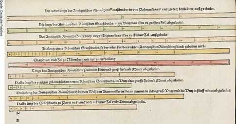 Keywords: Fotothek df tg 0000160 Messinstrumente ^ Maß ^ Maßstab.jpg Scan Deutsche Fotothek df_tg_0000160 color 2007 MIK-Center Berlin GmbH 88960160 251r Nürnberg Vergleich von Maßeinheiten Papier Holzschnitt koloriert 30 x 14 cm Messinstrumente Maß Maßstab ppn263566811 1547 Druck Deutsche Fotothek gefördert von der Deutschen Forschungsgemeinschaft Projekt Technikgeschichte 16 /17 Jh Verwalter Dresden Sächsische Landesbibliothek - Staats- und Universitätsbibliothek Dresden Optica 31 Herstellung Petrejus Johann Drucker aus Ryff Walther Hermann Buch Der furnembsten notwendigsten der gantzen Architectur angehoerigen Mathematischen und Mechanischen kuenst eygentlicher bericht und vast klare verstendliche unterrichtung zu rechtem Verstandt der lehr Vitruvij in drey furneme Buecher abgetheilet Nürnberg Petreius 1547 Das drit Buch/ der klaren und verstendlichen unterweisung der f\eurnembsten not wendigsten/ der gantzen Architectur angeh\eorigen Mathe matischen und Mechanischen k\eunst/ Der geometrischen messung Eigentliche abtheilung mancherley Meßstab und Waffen/ so man zu der Geometrischen Messung braucht zu gemeiner einleitung volgender unterrichtung von mancherlen kunstlicher Mathematischer messung SLUB Optica 31 Fotothek-License PD-old-100 Architectur by Walther Hermann Ryff Ell Units of length |