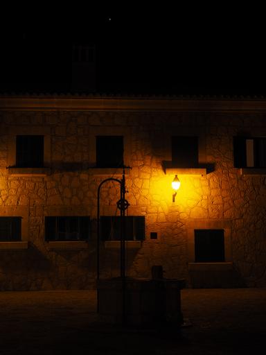 Keywords: fountain at night illuminated night photograph architecture lamps lamp glow monastery cura cura algaida courtyard hof building santuari de nostra senyora de cura monastery puig de randa balearic islands spain mallorca franciscan monastery place of pilgrimage