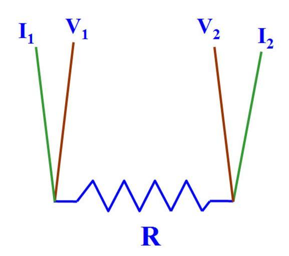 Keywords: Four point probe.jpg Two wires labeled by V1 and V2 are used for mesuring the voltage drop across the resistor R whereas the two wires labeled by I1 and I2 are for measuring the current through the resistor Own 2007-09-20 WingkLEE Resistor diagrams Resistor symbols |