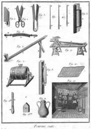 Keywords: Foureur outils.jpg Handwerkszeug des Kürschners und Fell-Trockenraum Aus Encyclopédie ou dictionaire raisonne des sciences des arts et des métiers von Denis Diderot und Jean de Rond d'Alembert Paris 1762-1777 <br/> IV <br/> FOURREUR<br/> EXPLICATION<br/> Outils <br/> Fig 1 Couteau à habiller A la lame B le manche <br/> 2 Gros ciseaux AA les taillans BB les anneaux <br/> 3 Forces AA les taillans BB le ressort <br/> 4 Carrelets AAA les tètes BBB les pointes C le piquet <br/> 5 Chevalet A le chevalet B la gambette C le piquet <br/> 6 Couteau à ècharner A la lame BB les Manches <br/> 7 Dégraiffoir A le tonneau B le couvercle C la manivelle DD les supports <br/> 8 Fer de pelletier A la lame B les moufles C le poteau <br/> 9 Bane à tirer les peaux A la perche B la moufle CC les pallissoirs DD leurs supports EE c les arcboutans F la table GG les treteaux <br/> 10 Claie <br/> 11 Pot de cuivre deltiné â faire chauffer les drogues <br/> 12 Élévation perspective de le`étuve à fecher les peaux AA le poèles BB c peaux étandues fur des cordes <br/> 13 Racloire A la lame B le manche <br/> 13 Paumelle <br/> own possession - collection Kuhn 10 01 2008 Kuerschner PD-old Läutertonne Handwerkszeug des Kürschners Diderot 1762-1777 jpg thumb Explication Furrier's knives Sewing equipment Encyclopédie ou Dictionnaire raisonné des sciences des arts et des métiers Furriers technology Fur working tools furrier Fur cleaning machines Scissors in art Knives in art Needles in art Fur dressers Furrier's collection Kuhn Retouched by Mbdortmund Furs literature French Diderot Denis |