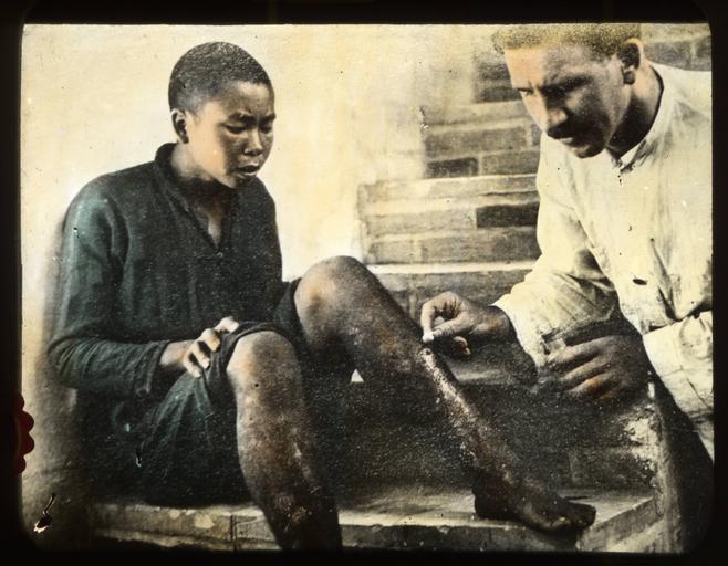 | Keywords: Fr. Bernard Meyer, MM, treating an injured person's leg, China, ca. 1918-1938 (MFB-LS0284).jpg en <br> Fr Bernard Meyer MM treating an injured person's leg China ca 1918-1938 Colorized lantern slide of Fr Bernard Meyer MM treating an injured person's leg Fr Meyer holds a vile in his left hand and dabs at the wound with the piece of cloth he holds in his right hand as the patient who sits on a brick staircase watches Photographer Unknown Subject keyword medical treatment; missionary work; clergy; general views Filename MFB-LS0284 Coverage date circa 1918/1938 Subject unesco medical treatment; missionary work; clergy Part of collection International Mission Photography Archive ca 1860-ca 1960 Type images Part of subcollection Photographs of the Catholic Foreign Mission Society of America Maryknoll New York 1912-1945 Part of repository Maryknoll Mission Archives Repository name Maryknoll Mission Archives Archival file impa_Volume33/MFB-LS0284 tiff Repository address Maryknoll Mission Archives PO Box 305 Maryknoll N Y 10545-0305 Geographic subject country China Geographic subject continent Asia Rights http //www maryknollsociety org/index php/articles/2-articles/593 Repository email archives maryknoll org Date created circa 1918/1938 Publisher of the digital version University of Southern California Libraries Format aat lantern slides Legacy record ID impa-m61036 Access conditions http //www maryknollsociety org/index php/articles/2-articles/593 File MFB/LanternSlides/LS0284 circa 1918 /1938 author http //digitallibrary usc edu/cdm/ref/collection/p15799coll123/id/11565 PD-old-70-1923 Magic lantern images Images from USC Digital Library uploaded by Fæ International Mission Photography Archive ca 1860-ca 1960 Clergy |