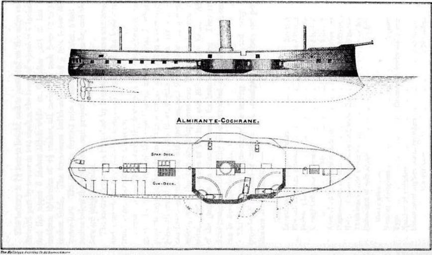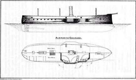 Keywords: Fragata blindada cochrane.jpg Elevacion y perfil de la fragata blindada Cochrane The War-Ships and Navies of the World 1880 1880 James Wilson King PD-old Cochrane ship 1874