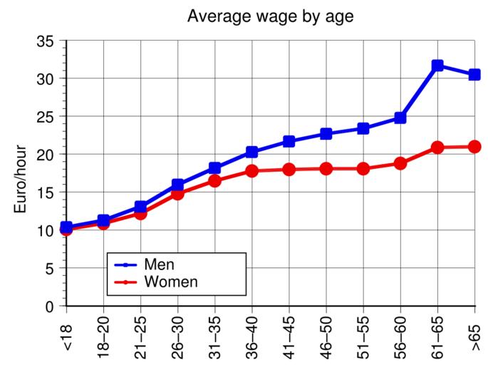 | Keywords: France average hourly wage by age and sex.svg en Average hourly wage in France by age and sex for 2013 Data source http //www insee fr/fr/themes/detail asp reg_id 0 ref_id ir-irsocdads2013 T101 2016-05-28 own Delphi234 other versions Generated with Wikimedia SVG Chart SVG Chart/box cc-zero Income distribution in France |