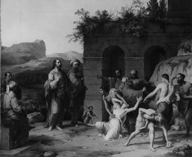 | Keywords: Francesco Hayez - Christ and the Woman Taken in Adultery - Walters 371825.jpg Shown is an incident from the Gospel of John 8 3-11 The adulteress forced into a kneeling position flails her arms as her executioners prepare to act To the left stands the serene imposing figure of Christ Spectators include Pharisees and scribes This small painting with its carefully delineated idealized figures and its remarkably clear atmosphere is reminiscent of the works of the Nazarenes a group of German painters active in Rome in the early 19th century 1841 Oil on canvas cm 43 2 53 9 accession number 37 1825 34500 Don Marcello Massarenti Collection Rome prior to 1881 Henry Walters city Baltimore Walters Art Museum Henry Walters Acquired by Henry Walters with the Massarenti Collection 1902 F Ayez 1841 signed and dated lower left the last two digits of the date are no longer visible place of origin Italy Walters Art Museum license 2D Francesco Hayez Media contributed by the Walters Art Museum needs category review Paintings in the Walters Art Museum Jesus Christ and the woman taken in adultery |