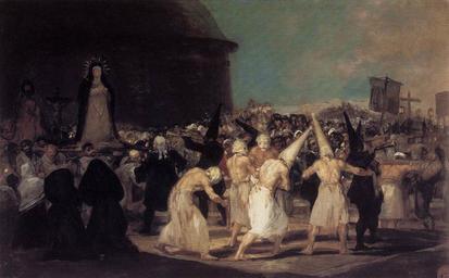| Keywords: Francisco de Goya y Lucientes - A Procession of Flagellants - WGA10086.jpg between 1812 1814 Oil on panel size cm 46 73 Institution Museo de la Real Academia de San Fernando Madrid object history credit line accession number WGA link 10086 http //www wga hu/art/g/goya/7/719goya jpg http //www wga hu/html/g/goya/7/719goya html PD-old-100 painting other Spanish 1801-1850 Paintings by Goya in the Royal Academy of Fine Arts of San Fernando 19th-century paintings WGA form painting WGA type other WGA School Spanish WGA time period 1801-1850 Self-flagellation in art |