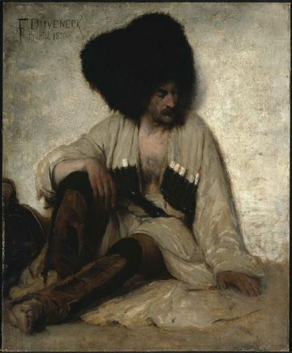 | Keywords: Frank Duveneck - Caucasian Soldier.jpg  Artwork Creator Frank Duveneck 1870 oil canvas cm 128 27 105 41 institution Museum of Fine Arts Boston Gallery 233 object history Provenance 1870 the artist; with Doll and Richards Boston; 1875 Miss Alice Hooper Boston; 1876 gift of Miss Alice Hooper to the MFA Accession Date May 11 1876 credit line Gift of Miss Alice Hooper Upper left F DUVENECK/Munich 1870 accession number 76 296 http //www mfa org/collections/object/a-circassian-30883 Museum of Fine Arts Boston http //images lunaimaging com/images/AMICA/Size4/2010/bmfa c25061 jpg PD-old-auto-1923 1919 Frank Duveneck Paintings in the Museum of Fine Arts Boston 1870 oil on canvas paintings in the United States 19th-century oil paintings of sitting men at full length Nations of Russian Empire in art Papakhi |