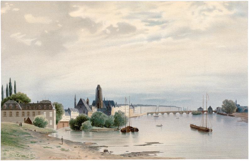 Keywords: Frankfurt Am Main-Carl Theodor Reiffenstein-FFMDFSIBUS-Heft 01-1894-014-Tafel 01-Crop.jpg Artwork Creator Carl Theodor Reiffenstein en 1 View of the City as seen from the Lower Main en 1 View of the City as seen from the Lower Main with the Main Island and to the left in the foreground the building of the Main Lust earlier Garden of Guaita from 1832 to 1859 a popular amusement place torn down 1873 with the construction of the waterside buildings Property of Theodor Voigt de 1 Ansicht der Stadt vom Untermain gesehen mit der Maininsel und links im Vordergrund dem Gebäude der Mainlust früher von Guaita'scher Garten von 1832 bis 1859 beliebtes Vergnügungslokal 1873 bei Anlage der Uferbauten niedergelegt Im Besitz des Herrn Theodor Voigt 1847 05 10 / 1894 technique chromolithograph watercolour size cm 14 29 22 14 unknown Private collection Mylius Frankfurt am Main object history credit line en Issue 1/6 de Heft 1/6 accession number Carl Theodor Reiffenstein Frankfurt am Main die freie Stadt in Bauwerken und Straßenbildern Carl Jügels Verlag M Abendroth Frankfurt am Main 1894 “99 PD-old-100 <gallery>File Frankfurt Am Main-Carl Theodor Reiffenstein-FFMDFSIBUS-Heft 01-1894-014-Tafel 01 jpg</gallery> Crops from Frankfurt am Main die freie Stadt in Bauwerken und Straßenbildern Mainkai Nizza-Ufer Schöne Aussicht Untermainkai Alte Brücke Frankfurt am Main Kaiserdom St Bartholomäus in the 19th century Leonhardskirche Frankfurt Remote views of the Kaiserdom St Bartholomäus 1847 in Frankfurt am Main