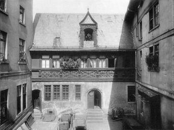 Keywords: Frankfurt Am Main-Fay-BADAFAMNDN-Heft 21-Nr 244-1904-Zum grossen Speicher.jpg From the present Bethmann Street an old building can be seen which is bordered by the Red Cross Lange named Dieterich's Lane up to the 17th century to one and the Rose Lane to the other side The estate was owned by the patrician family to the Wedel in the 14th century being court and garden at that time and was acquired by the family Knoblauch later Nowadays the ensemble of four wings frames a courtyard with the main entrance at the Bethmann Street via a portal overbuilt by a storey <br>The massive structure of this broad portal No 243 is made up of diamond ashlars in both its two pillars as well as in their terminal spandrel panels Two lion heads as part of a perch are visible above the portal to the right <br>In the courtyard primarily the almost completely preserved northern wing leaps to the eye on a simple ground floor of stones rests a storey in timber frame construction with exquisite wooden ornamentation No 244 A small cartouche with the date 1587 is put up above the door The aforementioned wooden ornamentation is common in its upper part The small dormer of the relatively high roof also displays rich wooden ornamentation H S Langenbach a former owner of the estate had the facade of the northern being restored by the architect Otto Lindheimer de Heft 21 Tafel 244 / Titel auf der Tafel Zum grossen Speicher / Originalbeschreibung Von der jetzigen Bethmannstrasse fällt der Blick auf ein altes Gebäude welches auf der einen Seite auf die Rothekreuzgasse sie führte bis zum 17 Jahrhundert den Namen Dieterichsgasse auf der anderen Seite auf die Rosengasse stösst Dieses Anwesen damals Hof und Garten gehörte im 14 Jahrhundert der Patrizierfamilie zum Wedel und gelangte später an die Familie Knoblauch Das Ganze bildet jetzt einen von vier Bauflügeln umschlossenen Hof mit dem Haupteingang nach der Bethmannstrasse früher Schüppengasse und zwar durch ein Tor welches mit einem Stockwerk überbaut ist <br>Dieses breite Portal No 243 ein massives Gefüge ist sowohl in seinen beiden Pfeilern als in der Wölbung und deren abschliessenden Zwickelfeldern aus Diamantquadern hergestellt Rechts über dem Portale sind auf einem Tragsteine zwei Löwenköpfe ersichtlich <br>Im Innern des Hofes fällt vor Allem der fast noch vollständig erhaltene Nordflügel in's Auge auf einem einfach gehaltenen unteren Steinbau ruht ein Fachwerkgeschoss mit vorzüglicher Holzornamentirung No 244 In einem Schildchen über der Türe ist die Jahreszahl 1587 angebracht Die oben genannte Holzornamentik ist im oberen Teile einfach gehalten Auf dem verhältnismässig hohen Dache sehem wir eine zierliche Dachgaube dessen Fenster ebenfalls in reicher Holzverzierung umrahmt ist Ein früherer Eigentümer der Liegenschaft H S Langenbach hat die Fassade dieses Nordbaus durch den Architekten Otto Lindheimer restaurieren lassen en Carl Friedrich Fay photographs Carl Friedrich Mylius older photographs Franz Rittweger legend issue 1 “25 Fritz Rupp legend issue 26 Bilder aus dem alten Frankfurt am Main Nach der Natur Verlag von Carl Friedrich Fay Frankfurt am Main 1896 “1911 de Carl Friedrich Fay Fotografien Carl Friedrich Mylius ältere Fotografien Franz Rittweger Bildtexte Heft 1 “25 Fritz Rupp Bildtexte Heft 26 Bilder aus dem alten Frankfurt am Main Nach der Natur Verlag von Carl Friedrich Fay Frankfurt am Main 1896 “1911 Creator Carl Friedrich Fay 1901 PD-old Großer Speicher Frankfurt 1901 in Frankfurt am Main 1901 Bilder aus dem alten Frankfurt am Main Nach der Natur |
