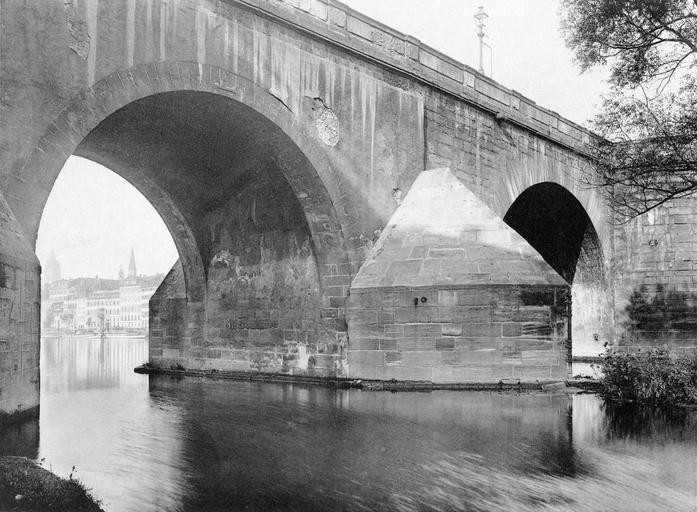 Keywords: Frankfurt Am Main-Fay-BADAFAMNDN-Heft 26-Nr 305-1911-Brueckenansicht mit Eisbrecher.jpg Follows de Heft 26 Tafel 305 / Titel auf der Tafel Brückenansicht mit Eisbrecher / Originalbeschreibung Zu den Denkmälern der alten Reichsstadt die durch Geschichte und Sage verklärt bestimmt sind für ewige Zeiten im Gedächtnis der Menschen fortzuleben gehört die žrote Mainbrücke Aus Mainsandstein errichtet auf massiven Pfeilern mit kräftigen Vorder- und Hinterköpfen die zwischen dem 5 und 7 Bogen eine architektonisch recht wirksame Ausbuchtung erfahren haben überspannt sie in halbkreisförmigen Bogen aus Quaderschichten den ruhig dahinströmenden Flusslauf Ueber das Alter sind wir nur schlecht unterrichtet Die erste urkundliche Erwähnung der alten Brücke geschieht im Jahre 1222 doch ist mit Sicherheit anzunehmen dass die Erbauung einer Holzbrücke in weit frühere Zeit hinaufreicht Mau kann sich kaum vorstellen dass die ansehnliche Niederlassung um den žSaalhoeff das alte Palatium Ludwigs des Frommen nicht schon sehr bald mit den ausgedehnten Wohnsitzen der Ministerialen in der Sachsenhäuser Gemarkung in direkter Verbindung gestanden hat Allein die Unsolidität des Materials und die rohe Naturgewalt worunter die Menschheit des Mittelalters in ganz anderer Weise zu leiden hatte als wir in unseren Tagen zwangen zu dem kostspieligen Ersatzbau in Stein Doch brachten Mangel an Mittel wie auch die Schwierigkeit geeignete Arbeitskräfte zu finden das monumentale Werk nur langsam voran Man fundierte die Pfeiler unmittelbar mit Hülfe von eichenen Schwellenrosten auf die Flusssohle die nicht etwa wie irrtümlich angenommen wird aus Tonschiefer sondern aus blauem Cyrenenmergel besteht der bei der verstärkten Strömung zwischen den Pfeilern den wachsenden Auskalkungen der Sohle nicht genügenden Widerstand entgegensetzt So wird denn im Laufe des 13 und 14 Jahrhunderts wiederholt von ausgeführten Steinarbeiten an Pfeilern und Schwibbogen berichtet Auch für König Heinrich den Sohn Friedrichs II bildete die Erhaltung der Brücke im Interesse des Reiches einen Gegenstand schwerer Sorge Der aus politischen Gründen vor allem den Städten wohlgesinnte junge Fürst verlieh im Jahre 1235 ein Privilegium zur halben Nutzung der Münze und zum Bezug des zur Reparatur der Brücke nötigen Holzes aus dem Reichswalde Auf das höchste bedroht muss aber die Erhaltung der Brücke um das Jahr 1300 gewesen sein Anders hat es keinen Sinn dass fünfzehn italienische Bischöfe einen Ablass für jene Gläubigen gewähren die zum Bau der vom Hochwasser zerstörten Pfeiler beitrugen Die Brückenbahn bestand zu jener Zeit zum grössten Teil aus Holz und gab dem Bauwerk noch nicht durch die eigene Schwere der gewaltigen Schwibbogen eine Stabilität die allen Unbilden der Witterung bis zum heutigen Tage getrotzt und entgegen den gemachten Einwänden auch für absehbare Zukunft noch trotzen würde Immerhin mag die Brücke im Jahre 1405 wie die Abbildung von dem Schreiber eines Bedebuches zeigt das heutige Aussehen gehabt haben Wenn dennoch aus dem Jahre 1419 berichtet wird dass man an dem letzten Pfeiler gearbeitet habe damit mam fernerhin ždes kostlichen buwes mit holczwercken nit bedarff sondern balken druber leget und druff brückendele so handelt es sich hier um die Beseitigung eines Zustandes den man im Hinblick auf unruhige Zeiten belassen hatte um gegebenen Falles ohne weitere Schwierigkeiten die Verbindung der beiden Flussufer aufzuheben Einen gewissen Schutz gewährte immer noch der über zwei Oeffnungen belassene Brückenbelag aus Bohlen der erst Ende des 16 Jahrhunderts durch Bogen am Sandstein ersetzt wurde Und böse Zeiten zogen für das ehrwürdige Denkmal herauf Im Jahre 1427 sah sich der Rat der freien Reichsstadt genötigt aus Furcht vor den wilden Horden der Hussiten die Bogen der Brücke mit schweren Balken versperren zu lassen Den Einspruch des in seinen Fluss- und Hoheitsrechten sich beschränkt glaubenden Erzbischhofs von Mainz nahm man leicht Etwa 100 Jahre später aber während der Bewegung des Bauernaufstandes der auch in das Maintal hinüber gegriffen hatte pflanzte die ärmere Bevölkerung der Stadt die Fahne der Empörung auf der Brücke auf ohne dass es jedoch zu ernsthafteren Zusammenstössen gekommen war Schlimmer erging es dem Bauwerk im schmalkaldischen Kriege Als das Protestantenheer zur Belagerung der damals in kaiserlichem Besitz sich befindenden Reichsstadt schritt hatte man alle Vorkehrungen zum Schutze des unentbehrlichen Verkehrsweges getroffen Grosse Leinentücher waren auf der Brücke gespannt und die Mühle selbst mit grossen Wollsäcken verstopft um sie während der Zeit der Bedrängnisse in Gang zu halten Der Hauptanschlag zur Zerstörung der Brücke vermittels schweren Geschützes vereitelte der Abschluss des Passauer Vertrages und der damit verbundene Abzug eines Teiles der Belagerungstruppen Kaum weniger ernst war die Lage der Brücke im dreissigjährigen Kriege Auf der Fahrbahn selbst kam es zu heftigem Kampfe und es muss als ein Wunder angesehen werden dass bei dem Geschützfeuer von Ufer zu Ufer wobei 26 Häuser in Asche gelegt wurden die Brücke selbst kaum wesentlichen Schaden erlitt Allein an dem Kruzifix seien wie die Ueberlieferung will noch heute die Spuren von Schwedenkugeln sichtbar Im siebenjährigen Kriege wie im Befreiungskriege hat ein günstiger Stern über der Stadt gewaltet und grössere Verluste ferngehalten Im Sturmjahre 1848 sah die Brücke die letzten kriegerischen Ereignisse die aber Spuren irgendwelcher Art an dem Denkmal nicht hinterlassen haben <br>Wie in Kriegszeiten so stand auch in den Jahren des Friedens die alte Mainbrücke im Mittelpunkt des Interessens der Bewohner Ein gewaltiger Menschenstrom zog jahraus jahrein auf uralten Handelswegen über die Brücke die zur Lebensader des Rhein- und Main-Gaues geworden war Durch besondere Gesetze geschützt bedrohte man einen jeden der auf der Brücke Streit anfing mit dem Abhauen der rechte