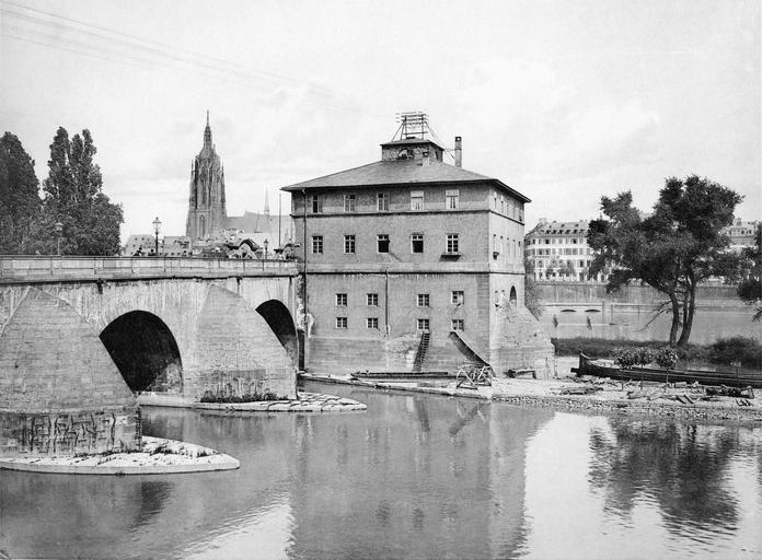 Keywords: Frankfurt Am Main-Fay-BADAFAMNDN-Heft 26-Nr 306-1911-Bruecke mit Brueckenmuehle.jpg Follows de Heft 26 Tafel 306 / Titel auf der Tafel Brücke mit Brückenmühle / Originalbeschreibung Zu den Denkmälern der alten Reichsstadt die durch Geschichte und Sage verklärt bestimmt sind für ewige Zeiten im Gedächtnis der Menschen fortzuleben gehört die žrote Mainbrücke Aus Mainsandstein errichtet auf massiven Pfeilern mit kräftigen Vorder- und Hinterköpfen die zwischen dem 5 und 7 Bogen eine architektonisch recht wirksame Ausbuchtung erfahren haben überspannt sie in halbkreisförmigen Bogen aus Quaderschichten den ruhig dahinströmenden Flusslauf Ueber das Alter sind wir nur schlecht unterrichtet Die erste urkundliche Erwähnung der alten Brücke geschieht im Jahre 1222 doch ist mit Sicherheit anzunehmen dass die Erbauung einer Holzbrücke in weit frühere Zeit hinaufreicht Mau kann sich kaum vorstellen dass die ansehnliche Niederlassung um den žSaalhoeff das alte Palatium Ludwigs des Frommen nicht schon sehr bald mit den ausgedehnten Wohnsitzen der Ministerialen in der Sachsenhäuser Gemarkung in direkter Verbindung gestanden hat Allein die Unsolidität des Materials und die rohe Naturgewalt worunter die Menschheit des Mittelalters in ganz anderer Weise zu leiden hatte als wir in unseren Tagen zwangen zu dem kostspieligen Ersatzbau in Stein Doch brachten Mangel an Mittel wie auch die Schwierigkeit geeignete Arbeitskräfte zu finden das monumentale Werk nur langsam voran Man fundierte die Pfeiler unmittelbar mit Hülfe von eichenen Schwellenrosten auf die Flusssohle die nicht etwa wie irrtümlich angenommen wird aus Tonschiefer sondern aus blauem Cyrenenmergel besteht der bei der verstärkten Strömung zwischen den Pfeilern den wachsenden Auskalkungen der Sohle nicht genügenden Widerstand entgegensetzt So wird denn im Laufe des 13 und 14 Jahrhunderts wiederholt von ausgeführten Steinarbeiten an Pfeilern und Schwibbogen berichtet Auch für König Heinrich den Sohn Friedrichs II bildete die Erhaltung der Brücke im Interesse des Reiches einen Gegenstand schwerer Sorge Der aus politischen Gründen vor allem den Städten wohlgesinnte junge Fürst verlieh im Jahre 1235 ein Privilegium zur halben Nutzung der Münze und zum Bezug des zur Reparatur der Brücke nötigen Holzes aus dem Reichswalde Auf das höchste bedroht muss aber die Erhaltung der Brücke um das Jahr 1300 gewesen sein Anders hat es keinen Sinn dass fünfzehn italienische Bischöfe einen Ablass für jene Gläubigen gewähren die zum Bau der vom Hochwasser zerstörten Pfeiler beitrugen Die Brückenbahn bestand zu jener Zeit zum grössten Teil aus Holz und gab dem Bauwerk noch nicht durch die eigene Schwere der gewaltigen Schwibbogen eine Stabilität die allen Unbilden der Witterung bis zum heutigen Tage getrotzt und entgegen den gemachten Einwänden auch für absehbare Zukunft noch trotzen würde Immerhin mag die Brücke im Jahre 1405 wie die Abbildung von dem Schreiber eines Bedebuches zeigt das heutige Aussehen gehabt haben Wenn dennoch aus dem Jahre 1419 berichtet wird dass man an dem letzten Pfeiler gearbeitet habe damit mam fernerhin ždes kostlichen buwes mit holczwercken nit bedarff sondern balken druber leget und druff brückendele so handelt es sich hier um die Beseitigung eines Zustandes den man im Hinblick auf unruhige Zeiten belassen hatte um gegebenen Falles ohne weitere Schwierigkeiten die Verbindung der beiden Flussufer aufzuheben Einen gewissen Schutz gewährte immer noch der über zwei Oeffnungen belassene Brückenbelag aus Bohlen der erst Ende des 16 Jahrhunderts durch Bogen am Sandstein ersetzt wurde Und böse Zeiten zogen für das ehrwürdige Denkmal herauf Im Jahre 1427 sah sich der Rat der freien Reichsstadt genötigt aus Furcht vor den wilden Horden der Hussiten die Bogen der Brücke mit schweren Balken versperren zu lassen Den Einspruch des in seinen Fluss- und Hoheitsrechten sich beschränkt glaubenden Erzbischhofs von Mainz nahm man leicht Etwa 100 Jahre später aber während der Bewegung des Bauernaufstandes der auch in das Maintal hinüber gegriffen hatte pflanzte die ärmere Bevölkerung der Stadt die Fahne der Empörung auf der Brücke auf ohne dass es jedoch zu ernsthafteren Zusammenstössen gekommen war Schlimmer erging es dem Bauwerk im schmalkaldischen Kriege Als das Protestantenheer zur Belagerung der damals in kaiserlichem Besitz sich befindenden Reichsstadt schritt hatte man alle Vorkehrungen zum Schutze des unentbehrlichen Verkehrsweges getroffen Grosse Leinentücher waren auf der Brücke gespannt und die Mühle selbst mit grossen Wollsäcken verstopft um sie während der Zeit der Bedrängnisse in Gang zu halten Der Hauptanschlag zur Zerstörung der Brücke vermittels schweren Geschützes vereitelte der Abschluss des Passauer Vertrages und der damit verbundene Abzug eines Teiles der Belagerungstruppen Kaum weniger ernst war die Lage der Brücke im dreissigjährigen Kriege Auf der Fahrbahn selbst kam es zu heftigem Kampfe und es muss als ein Wunder angesehen werden dass bei dem Geschützfeuer von Ufer zu Ufer wobei 26 Häuser in Asche gelegt wurden die Brücke selbst kaum wesentlichen Schaden erlitt Allein an dem Kruzifix seien wie die Ueberlieferung will noch heute die Spuren von Schwedenkugeln sichtbar Im siebenjährigen Kriege wie im Befreiungskriege hat ein günstiger Stern über der Stadt gewaltet und grössere Verluste ferngehalten Im Sturmjahre 1848 sah die Brücke die letzten kriegerischen Ereignisse die aber Spuren irgendwelcher Art an dem Denkmal nicht hinterlassen haben <br>Wie in Kriegszeiten so stand auch in den Jahren des Friedens die alte Mainbrücke im Mittelpunkt des Interessens der Bewohner Ein gewaltiger Menschenstrom zog jahraus jahrein auf uralten Handelswegen über die Brücke die zur Lebensader des Rhein- und Main-Gaues geworden war Durch besondere Gesetze geschützt bedrohte man einen jeden der auf der Brücke Streit anfing mit dem Abhauen der rechten Hand D