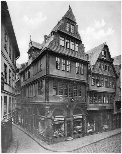 | Keywords: Frankfurt Am Main-Fay-BADAFAMNDN-Heft 21-Nr 241-1904-Zur Goldenen Waage Alter Markt -UCSAR.jpg Artwork Creator Carl Friedrich Fay 241 To the Goldene Waage Golden Scale Alter Markt Old Market Hier standen früher zwei Häuser das Eckhaus das als Haus Colmann bezeichnet wurde und das nebenstehende žzur alten Hölle ; im Anfang des 15 Jahrhunderts wurden beide vereinigt und im Laufe des 16 Jahrhunderts taugte der Name žGoldene Waage auf Im Jahre 1450 war eine Trinkstube darin Später erwarb es die Stadt und liess es von dem Architekten von Hoven im alten Stile restauriren Ueber dem aus Sandstein errichteten Erdgeschoss erheben sich zwei in starken Ueberhängen hervorspringende Obergeschosse aus Fachwerk und darüber der zweigeschossige Giebel an der Marktseite ebenfalls Fachwerk zeigend; dieses war aber lange Zeit mit Schiefer überkleidet Das Untergeschoss aus rotem Sandstein gewährt einen überaus schönen Anblick Die Pfeiler sind in Diamantquadern gearbeitet und umschliessen nach dem Markt zu zwei breite Bogenfenster nebst Ladentüre Der Ladenraum war früher ein grosses Gewölbe welches aber später geteilt wurde Die rundbogigen Oberlichter sind mit prächtigem Gitterwerk versehen die auf den Pfeilern ruhenden Tragsteine mit Löwenköpfen geziert Der Tragstein des Eckpfeilers zeigt eine hockende weibliche Figur mit Früchten umgeben <br>In ähnlicher Weise ist die Seite nach der Höllgasse gehalten Die Eckpfeiler der Obergeschosse sind in Holz geschnitzt zeigen aber einfachere Tragsteine Auf der Plattform bildet ein geschieferter schöner Kuppelbau den Ausgang der Wendeltreppe des Treppenturms Auf dem Dache befindet sich die in Heft III No 27 schon dargestellte Dachlaube nebst Brunnen von hier aus erschliesst sich eine überraschende Aussicht nach dem Pfarrturm und der Stadt Die Stuckdecke im Saale des ersten Obergeschosses ist figürlich reich ausgestattet <br>Unser Bild gibt das Haus aus der Zeit wieder als seine Ansicht noch durch die schmale Höllgasse beengt war; jetzt gewährt es durch den Abbruch der ihm gegenüber in engster Entfernung gestandenen Häuser und durch die dadurch bewirkte Freilegung des Domes einen fesselnden und interessanten Anblick 1899 technique collotype dry plate size cm 22 05 17 49 unknown Private collection Mylius Frankfurt am Main object history credit line Uncropped semi-automatically retouched version Unbeschnittene halbautomatisch retuschierte Fassung accession number Carl Friedrich Fay Carl Friedrich Mylius Franz Rittweger Fritz Rupp Bilder aus dem alten Frankfurt am Main Nach der Natur Verlag von Carl Friedrich Fay Frankfurt am Main 1896 “1911 PD-old Bilder aus dem alten Frankfurt am Main Nach der Natur Höllgasse Markt Frankfurt am Main Haus zur Goldenen Waage Demolished buildings in Frankfurt-Altstadt 1899 in Frankfurt am Main |