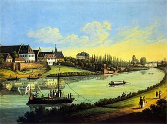 | Keywords: Frankfurt Am Main-Mainpanorama mit Gutleuthof-um 1825.jpg en Frankfurt on the Main Panorama of the Main with the Gutleuthof Gutleut's yard Gouache Nicolas Alexandre Salins de Montfort 1753 Versailles; 1838 Nantes ein Herrenhaus die sogenannte Villa Gut Gogel die schon 1805 bezugsfertig war errichten Auch legte er einen Landschaftspark an um die ländliche Ruhe zu genießen Die an exponierter Stelle gelegene Villa mit halbrundem Gartenhaus muss schon in historischer Zeit ein Blickfang für Schiffsreisende von und nach Frankfurt gewesen sein Nachfolgende Generationen der Familie Gogel erwarben noch Gelände an der Ostgrenze dazu und bauten das Anwesen mit Scheunen Stallungen und Wirtschaftsgebäuden aus Nach einer Beschreibung in Schriften des historischen Museums von 1929 hatte das Gebäude einen langrechteckigen Grundriss der sich nach dem Main halbkreisförmig ausbuchtete Der Aufbau des Hauses war zweigeschossig Ein Sockelgeschoss mit Fugenschnitt und ein Hauptgeschoss über einem breiten Gutgesims Vor den Dächern lag eine niedrige Attika Ein halbrunder Vorbau öffnete sich im ersten Stock nach außen in einer mit Säulen ausgestellten Loggia Er war mit einem Kuppeldach eingedeckt Zu der Zeit als der als Quelle dienende Artikel erschien soll das Landhaus unter Verwahrlosung und rücksichtslosen Umbauten an Bedeutung verloren haben An einem der beiden heute noch existierenden erhöhten Aussichtsplätzen an der Ufermauer ließ Gogel Arkaden nach antikem Vorbild errichten Die Arkaden die sehr kostbar waren stammten aus dem Besitz der ehemaligen Benediktiner-Abtei Neustadt am Main Gogel erwarb sie vom Fürsten von Löwenstein-Wertheim auf den die Abtei bei der Säkularisation übergegangen war 1970 wurde die Arkadenreihe abgetragen und auf Bitten des Landrats des Kreises Lohr am Main in das Benediktinerkloster Neustadt zurückgebracht Gogel erwarb im Laufe der Zeit noch Gelände an der Ostseite des Hofes hinzu Er ließ dort Scheunen Stallungen und Wirtschaftsgebäude neu errichteten Der Park mitsamt dem Anwesen galt damals zu einem der schönsten in Frankfurt Quelle http //www gutleuthist de/villagogelundsommerhoff html en Modern offset printing scanned de Moderne Offsetwiedergabe gescannt en Unknown de Unbekannt en around 1825 de um 1825 PD-old Demolished buildings in Frankfurt-Gutleutviertel 1825 in Frankfurt am Main Nicolas Alexandre Salins de Montfort |