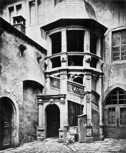 | Keywords: Frankfurt Am Main-Roemer-Roemerhoefchen-Alt-Limpurg vor Umbau 1889.jpg  Renaissance-Treppenturm des Hauses Alt-Limpurg Scan der Offsetwiedergabe einer Fotografie vor 1891 Der an der westlichen Hofseite des Hauses Alt-Limpurg anschließende Treppenturm aus dem Jahr 1627 ist bis heute erhalten und stellt eines der wenigen ganzheitlichen Bauteile des Römerkomplexes dar dass die massiven Kriegszerstörungen überstand Da das Haus Alt-Limpurg bis 1878 der gleichnamigen Ganerbschaft gehörte trennte eine hohe Mauer die südliche Seite des heutigen Römerhöfchens von der Nordseite mit den Römerwachen die schon seit dem Mittelalter der Stadt gehörte Nach dem Kauf des Hauses Alt-Limpurg durch die Stadt wurde die Mauer obsolet und 1891 niedergelegt das Foto ist also ein rares Zeugnis dieses noch weitgehend mittelalterlichen Bauzustandes Urheberrechtliche Ansprüche dürften aufgrund des Alters erloschen sein PD-old Haus Alt-Limpurg 1889 in Frankfurt am Main Stair towers Stairs in Hesse  |